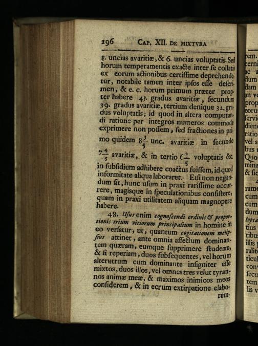 3. uncias avaritie,& 6. uncias voluptatis. Sel horum temperamentis exa&te inter fe collati €X eorum aGionibus certiffime deprehende tur, notabile tamen inter ipfos efle| defcri men,& e. c. horum primum preter prop terhabere 4j. gradus avaritize; fecundum 39. gradus avaritiz, tertium denique 32.gr* dus voluptatis; id quod in altera computat di retione per integros numeros commod: exprimere non poffem, fed fra&ionesin pii