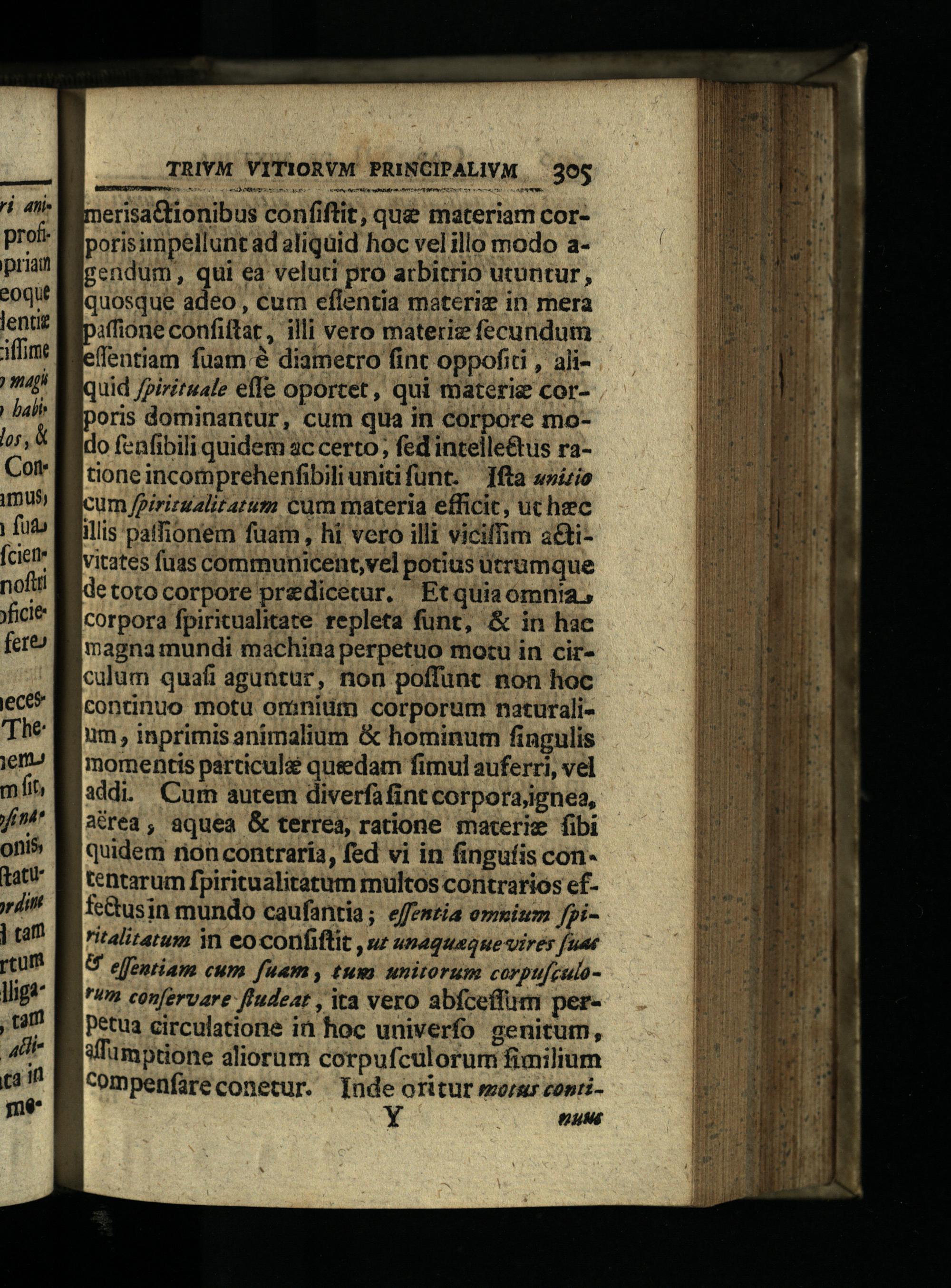 merisactionibus confiftit, que materiam corporisimpellunt ad aliquid hoc velillo modo agendum, qui ea veluti pro arbitrio utuntur, quosque adeo, cum eflentia materiz in mera piffione confiftar, illi vero materiz fecuridum eflentiam fuam& diametro fint oppofii, aliquid /pirituale effe oportet, qui materie corporis dominantur, cum qua in corpore modo fcafibili quidem ac certo; fed intelle&tus ratione incomprehenfibili unii funt. fta«»4io cum fpirirsaliratum cum materia efficit, uc hec illis paffionem fuam, hi vero illi vicilfim a&ivitates fuas communicent,vel potius utrumque etotocorpore predicetur, Etquiaómnia, corpora fpiritualitate repleta funt,& in hac magna mundi machina perpetuo mozu in circulum quafi aguntur, non poffunt non hoc continuo motu omnim corporum naturalium, inprimisanimalium& hominum fingulis momentis particula quedam fimul auferri, vel addi. Cur autem diverfa fint corporajgnea, acrea, aquea& terrea, ratione materie fibi quidem rion contraría, fed vi in finguíis contentarum fpiritualitatum multos coritrarios effe&usin mundo caufantia; effenzia ommium[piritalitatum in eoconfiftit ,u unaquague vires fuat S effontiam cum fuam, tum unitorum corpufculoFm confervare ffudeat, ita vero abfceflum perpetua circulatione in hoc univerfo genitum, sflumptione aliorum corpufculorum fimilium Compenfareconetur. nde oritur morus zonriY ad