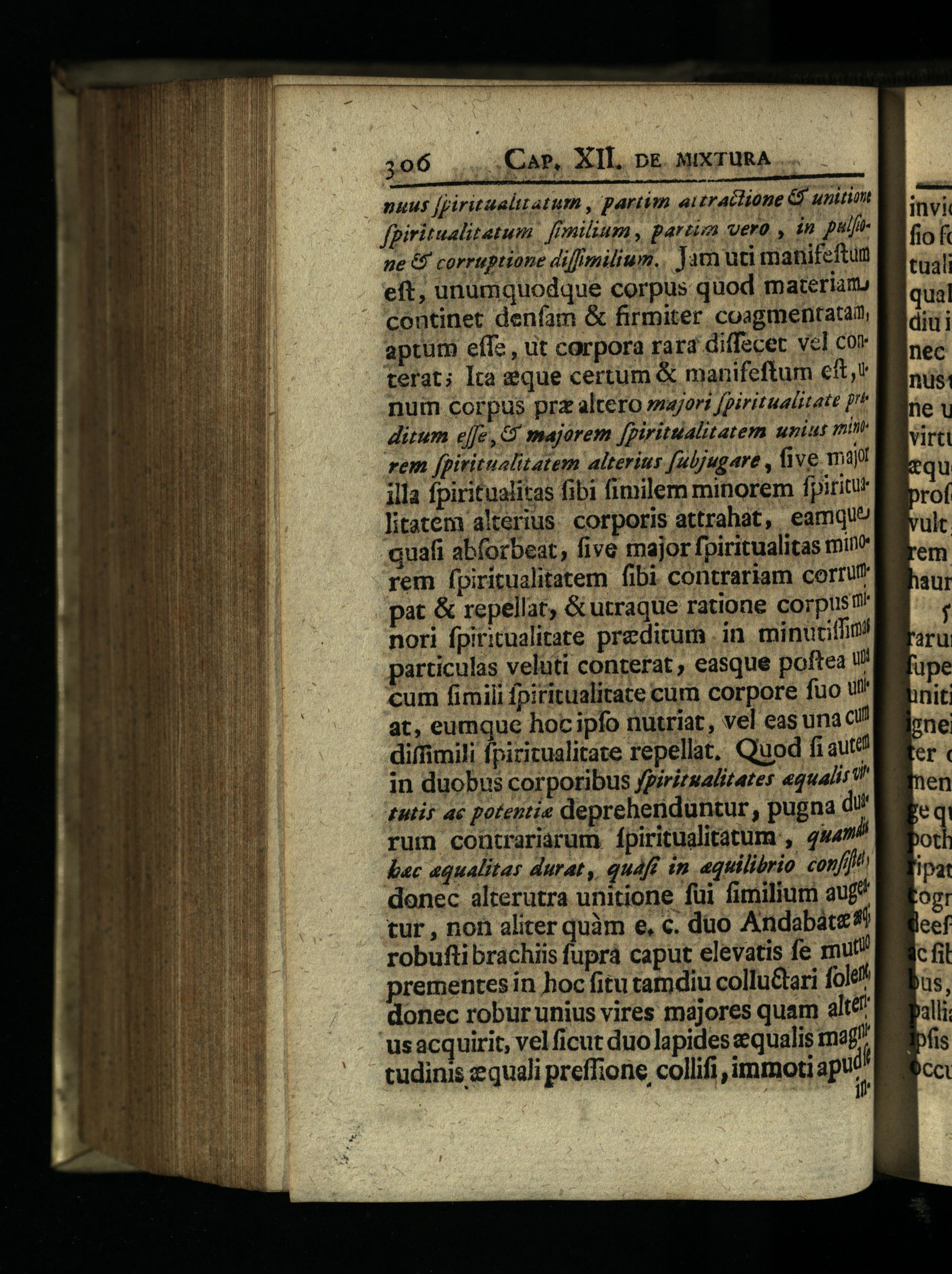 Tesi t i rm ttp t nuus[piritualitatum, partim aitraclione Gf unitim fpiritualitetum femilium, parziza vero, in puline& corruptione diffmilium.. Jam uti manifeftum eft, unumquodque corpus quod materiam continet denfam& firmiter coagmentatai, aptum effz, ut carpora rara diffecet vel cor terat; lra eque certum& manifeftum cft! num corpus prz altero majori fpirituatitate pr ditum effe ,& majorem[piritialitatem unius min rem fpiritualitatem alterius[uljugare, five. maj illa fpiritualitas fibi fimilem minorem fpiritu litatem alterius corporis attrahat, eamque quafi abforbeat, five major fpiritualitas min? rem fpiritualitatem fibi contrariam corru? pat& repellat,& utraque ratione corpus nori fpiritualitare predium in minutiffin particulas veluti conterat easque poftea ul cum fimili fpiritualitate cum corpore fuo t at, eumque hoc ipfo nutriat, vel eas una ci! diffimili fpiritualitate repellat, Quod fi aut? in duobus corporibus jperizsalitates equali tutis ac potentie deprehenduntur, pugna di rum contrariarum ípiritualitatum, 447 bec aqualitas durat, quáft in aquilibrio conf] donec alterutra unitione fui fimilium auf^ tur, non aliter quàm e, c. duo Andabátz f? robufti brachiis fuprá caput elevatis fe muti prementes in hoc fitu tamdiu collu&ari fole donec robur unius vires majores quam alt us acquirit, vel ficut duo lapides equalis maf,