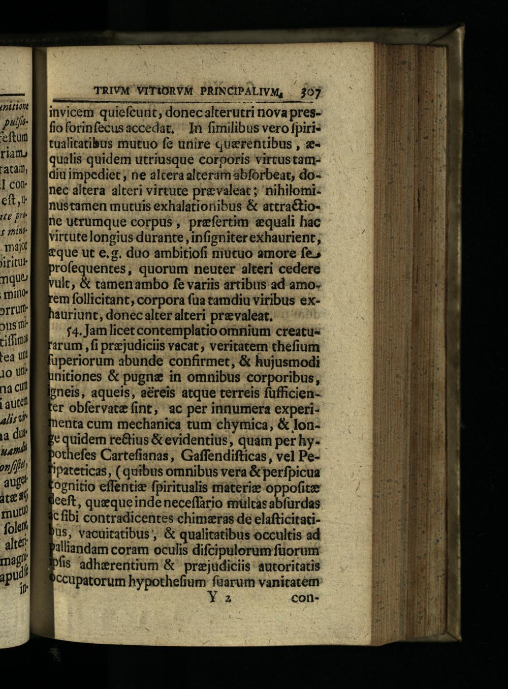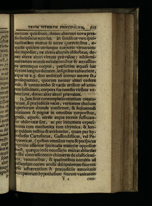 ... TRIVM VITIORYM PRINCIPALIVM, 207 mem mMEEEE Rt invicem quiefeurt, donec alterutri nova presfioforinfecusaccedat,^ In fimilibus vero fpiritualitatibus mutuo fe unire quarentibus, z« qualis quidem utriusque corporis virtustamdiu impediet, ne altera alteram abforbeat, donec altera alteri virtute pre valeat;"nihilominüstamen mutis exhalationibus& atcra&tione utrumque corpus, prefertim equali hac virtute longius durante, infigniter exhaurient, «que ut e.g. duo ambitiofi mutuo amore fe. profequentes, quorum neuter alteri cedere ult;& tamenambo fe variis artibus ad amoem follicitant, corpora fua tamdiu viribus exauriunt, donec alter alteri przvaleat. f4. Jam licet contemplatio omnium creatus arum ,fi prz;judiciis vacat, veritatem thefium uperiorum abunde confirmet,& hujusmodi nitiones& pugne in omnibus corporibus, zneis, aqueis, aereis atque terreis fufficiener obfervatefint, ac per innumera experienta cum mechanica tum chymica,& lonJe quidem re&tius& evidentius, quám per hyPothefes Cartefianas, Gaffendifticas, vel PeIpateticas,( quibus omnibus vera&perfpicua ognitio effentie fpiritualis triaterizs oppofitze ieeft, queequeindeneceffario mülcas abfurdas Cfibi contradicentes chimsras de elafticitatiJUS, vacuitatibus',& qualitatibus occultis ad illiandam coram oculis difcipulorum füorun
