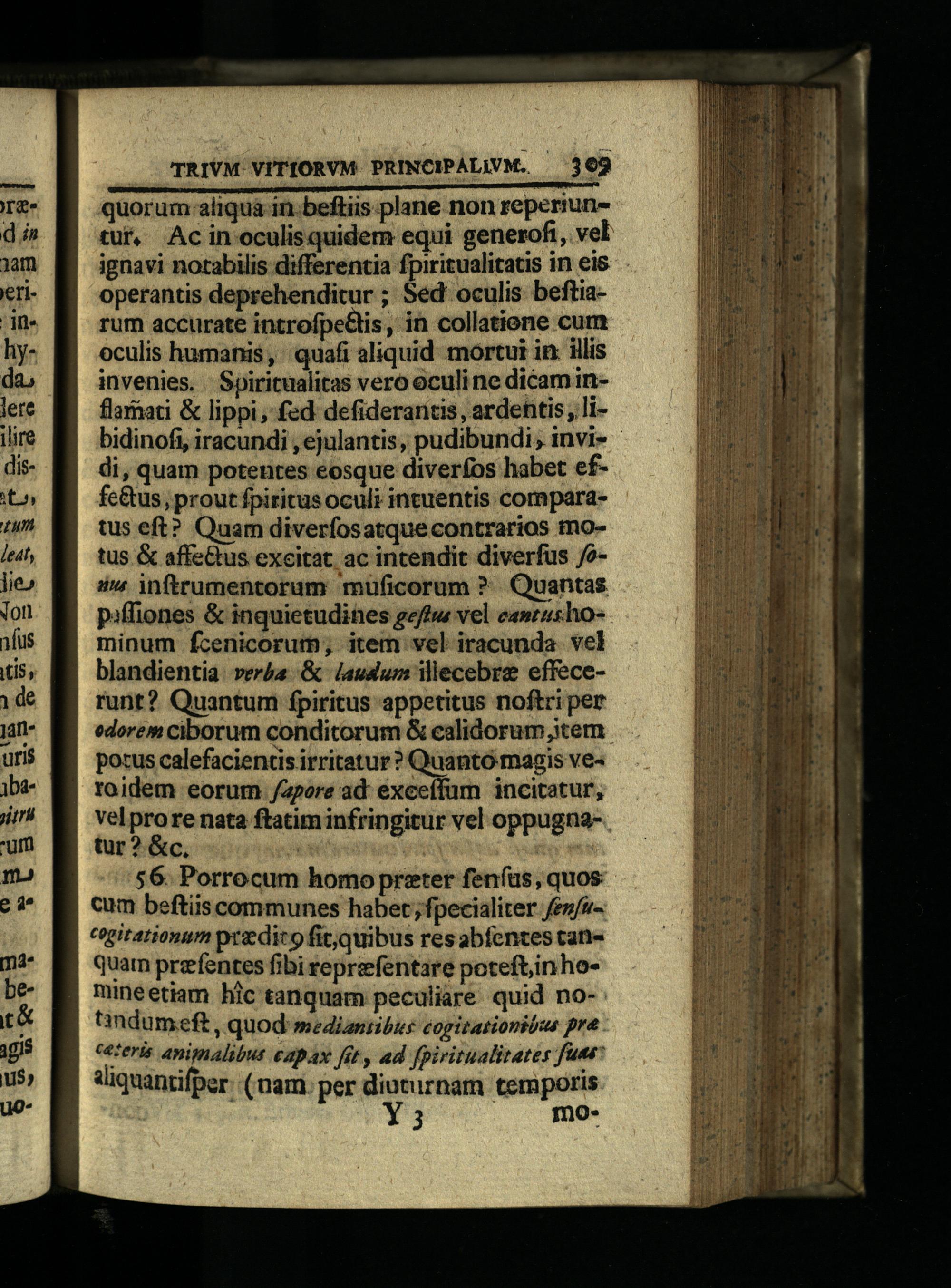 quorum aliqua in-beftiis plane non reperiuntuf, Ac in oculisquidem equi generofi, vel ignavi notabilis differentia fpiritualitatis in eis. operantis deprehenditur; Sed oculis beftiarum accurate introfpe&tis, in collatione cum oculis humanis, quafi aliquid mortui in: illis invenies.. Spiritualitas vero oculi ne dicam inflaati& lippi, fed defiderancis, ardetitis, libidinofi, iracundi, ejulantis, pudibundi, invidi, quam potentes eosque diverfos habet effe&us, prout fpiritus oculi intuentis comparatus eft? Quam diverfosatque contrarios motus& affe&us excitat. ac incendit diverfus /o3^ inftrumentorum muficorum?. Quantas piffiones& inquietudihes geffw vel canrsshominum fcenicorum, item vel iracunda vel blandientia. ver&a& /audum illecebre effecerunt? Quantum fpiritus appetitus noftri per edorem ciborum conditorum& calidorum tem potus calefacientis irritatur? Quanto magis ve« roidem eorum /apoere ad: exceffum incitatur, velprore nata ftatim infringitur vel oppugna-. tur?&c,; $6. Porrocum homo prater fenfüs, quos cum beftiis communes habet;fpecialiter /en/4ctgitationum przdico fit,quibus res abfentes canquam przfentes fibi repriefentare poteft,inhomineetiam hic tanquam peculiare quid noGndumeft, quod medianribur cogitationibus pre ceteris animalibus capax fit, ad fpiritualitates fuae: sliquantifper:(nam. per diuturnam temporis Y3 2 o0gmo