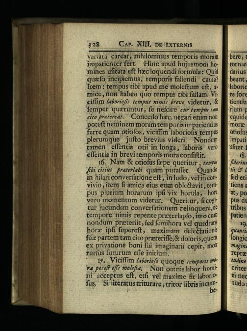 16. Nam& otiofus fzpe queritur, rev?" Jfbi citius praterlabi: quam putaffet.— Quando in hilari converfacióne eft, in ludo, velin con vivio itetr ft amica eius eum oblcGavit tem pus plurium horarum ipfi vix horüla;- hor! vero momentum videtur,^ Queritur, ficog* tur jucundam converfationem relinquere, d* tempore nimis repente preterlapfo, imo cum nondum preteriit, fed fzmihora vel quadrans horz ipfi fupereft, maximam deleétations fuz partem tam cico preteriffe,& doloris,quem ex privatione boni fui imaginarii cepit, mot rurfus futurum efle initium.