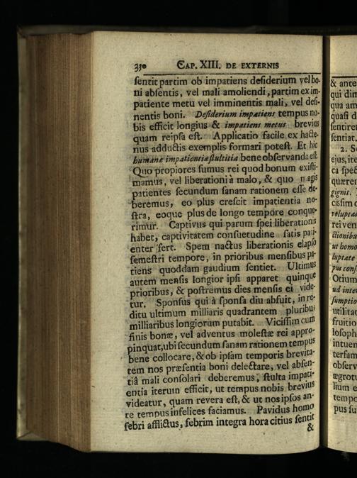 ni abfentis, vel mali amoliendi, partim ex impátiente metu vel imminentis: mali, ve] def. nentis boni. Deffderium impatienr tempus nobis efficit longius-& Zwpatien: metus. brevis quàm reipfa eft. A pplicatio facile. ex hae. nus addu&tis exemplis formari poteft. Et hic "bumana iepatiéntieflultitia bene obfervand: ef "Quo propiores fumus rei quod bonum exift "mamus, vel liberationià malo,& quo r95 "patientes fecundum fanam rationem effe de JBeremus, eo plüs crefcit impatientia. no fira, eoque plusde longo tempóre conque rimur.'Captivus qui parum fpei liberationis habet, captivitatem confuetudine. fatis pst enter fert. Spem na&us liberationis elapi? (emeftri tempore, in prioribus menfibus p tiens" quoddam gaudium fentiet. Ukinn autem menfis longior ipfi apparet. quinq! prioribus,& poftremus dies menfis ei vide tur, Sponfus qui'à fponfa diu-abfuit, 107^ ditu ultimum milliaris quadrantem. pluribu milliaribus longiorüm putabit.... Viciffim cu finis bone, vel adventus molefte rei appro, pinquat;ubi fecundum fanam rationem temp bene collocare;&ob ipfam temporis brevi cém nos prefentia boni dele&are; vel abf tà mali confolari: deberemus; ftulta impitt entia iteruin efficit, ut tempus nobis brevis videatur, quam revera eft,& ut nos ipfos à F te rempusinfelices faciamus... Pavidus homt
