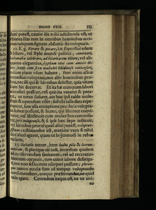 23. Sa/tatio autem, item /udus pile& latrunlorum,& plerique alii ludi, interdum quidem &d cosfervandam fanitatem, vel ad recreatioliem tum corporis, tum animi labore defatiganecnon ád lucrum ufürpari poffünt; pleruz1e tamen media funt ad tempus voluptuofis confümendum, eosque przfervandes,ne quid Wieagant.| Cavendum itaque eft; ne ex uni