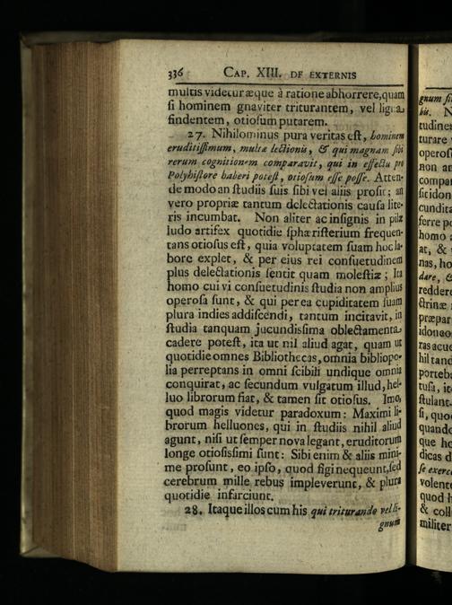 27. Nihilominus pura veritas eft, Zomi»m eruditiffmum., multa leilion,& qui spagnam[li rerum cognirionem comparavit, qui án. effelu in Polybiftere baberi potefl, ociofum effe poffe. Atene de modoan ftudiis fuis fibi vel aliis profic; ai vero proprie tantum dclectationis caufa lite ris incumbat,| Non aliter acinfignis in pil ludo artifex. quotidie fpharifterium frequen rans otiofus eft, quia voluptatem fuam hocl bore explet,& per eius rei confuetudinem plus deleclationis fentit quam moleftiz; lt homo cui vi confüetudinis ftudia non amplius operofa funt,& qui perea cupiditatem iuam plura indies addifcéndi, tantum incitavit, i! ftudia tanquam jucundis(ima oble&amento: cadere poteft, ita ut nil aliud agat, quam ut quotidieomnes Bibliothecas, omnia bibliopo lia perreptans in omni fcibili undique omni conquirat, ac fecundum vulgatum illud, he" luo librorum fiat,& tamen fit otiofus, mo quod magis videtur paradoxum: Maximi l* brorum helluones, qui in. ftudiis nihil aliud agunt, nifi ut femper nova legant, eruditorum longe otiofisfimi funt: Sibi enim& aliis mini . me profunt, eo ipfo, quod figinequeunt cerebrum mille rebus impleverunc,& pluri quotidie infarciunt,. Went