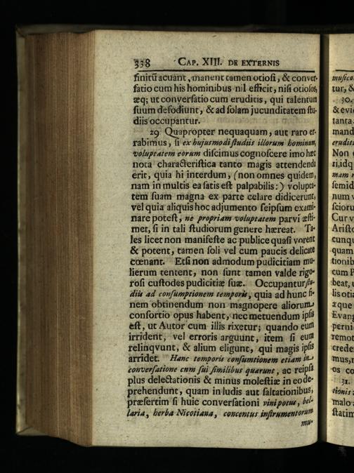 29. Quapropter nequaquam, aut raro etrabimus, fi ex bujurmodi fludis illorum bominum voluptatem eorum difcimus cognofcere imo htt nota' charaCleriftica tanto magis attendendi erit, quia hi incerdum,(non omnes quidem, nam in multis ea fatis eft palpabilis:) voluptt tem fuam magna ex parte celare didicerunt; vel quia aliquis hoc adjumento feipfum exam nare poteft,»e propriam voluptatem parvi eft met, fi in tali ftudiorum genere hereat.. T* les licec non manifefte ac publice quafi vorett & potent, tamen foli vel cum paucis delicitt coenanr.— Etfi non admodum pudicitiam mt lierum tentent, non fünt tamen valde rig* rofi cuftodes pudicitiz füz.^ Occupantur/^ diis ad confumprionem tempori, quia ad hunc f nem obtinendum: non magnopere aliorum» confortio opus habent, nec metuendum ip! eft, ut Autor cum illis rixetur; quando eu! irrident, vel erroris arguunt, item íi eui relinqvunt,& alium eligunt, qui magis ip? arridet.'Hanc temporis confumtionem etiam i^ conver[atione cmm fui ffmilibur querunt, aC reipfi plus delectationis& minus moleftiz in eode prehendunt, quam in ludis aut faltationibus; prefertim fi huic converfationi visio,^^