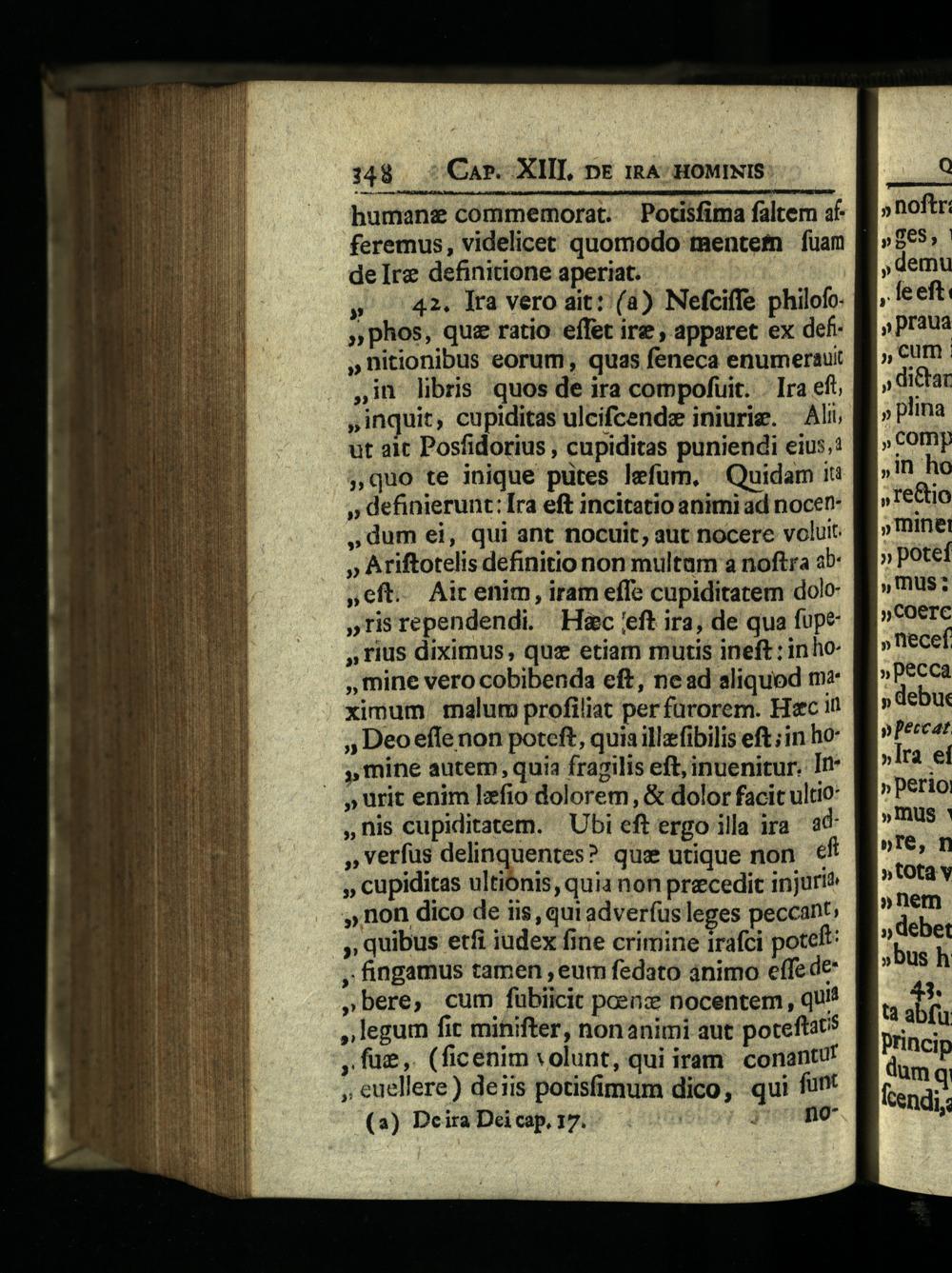 buman&e commemorat. Pocisfima faltem afferemus, videlicet quomodo mentefn fuam de Ire definitione aperiat. » 42. Ira vero ait:(a) Nefciffe philofo» phos, que ratio effet ire, apparet ex def. »nitionibus eorum, quas feneca enumerauk »in libris quos de ira compofuit.. Ira eft » inquit, cupiditas ulcifcendz iniuriz.— Alii ut ait Posfidorius, cupiditas puniendi eius;? »quo te inique putes lefüm, Quidam it: » definierunt:[ra eft incitatio animi ad nocen ,dum ei, qui ant nocuit, aut nocere voluit » Ariftotelis definitio non multam a noftra ab »eft. Airenim, iram effe cupiditatem dolo »risrependendi. Hsc eft ira, de qua fupe ,rius diximus, quz etiam mutis ineft: inho, mine vero cobibenda eft, ne ad aliquod m ximum. malum profiliat perfürorem. Hsc i! , Deoeffe non poteft, quia illzfibilis eft;in ho » mine autem, quia fragilis eft, inuenitur. I* »urit enim lzfio dolorem,& dolor facit ultio ,nis cupiditatem. Ubi eft ergo illa ira 2d ,verfus delinquentes? quiz utique non€ » cupiditas ultionis, qui1 non precedit injuri? » non dico de iis, qui adverfus leges peccant; » quibus etfi iudex fine crimine irafci poteft: , fingamus tamen, eum fedato animo effede »bere, cum fübiicic poenz nocentem, qui? ,.legum fit minifter, nonanimi aut poteftat* , fue,(ficenim volunt, qui iram conantut , euellere) deiis potisfimum dico, qui fun (a) Dcira Dei cap, 17. ymo
