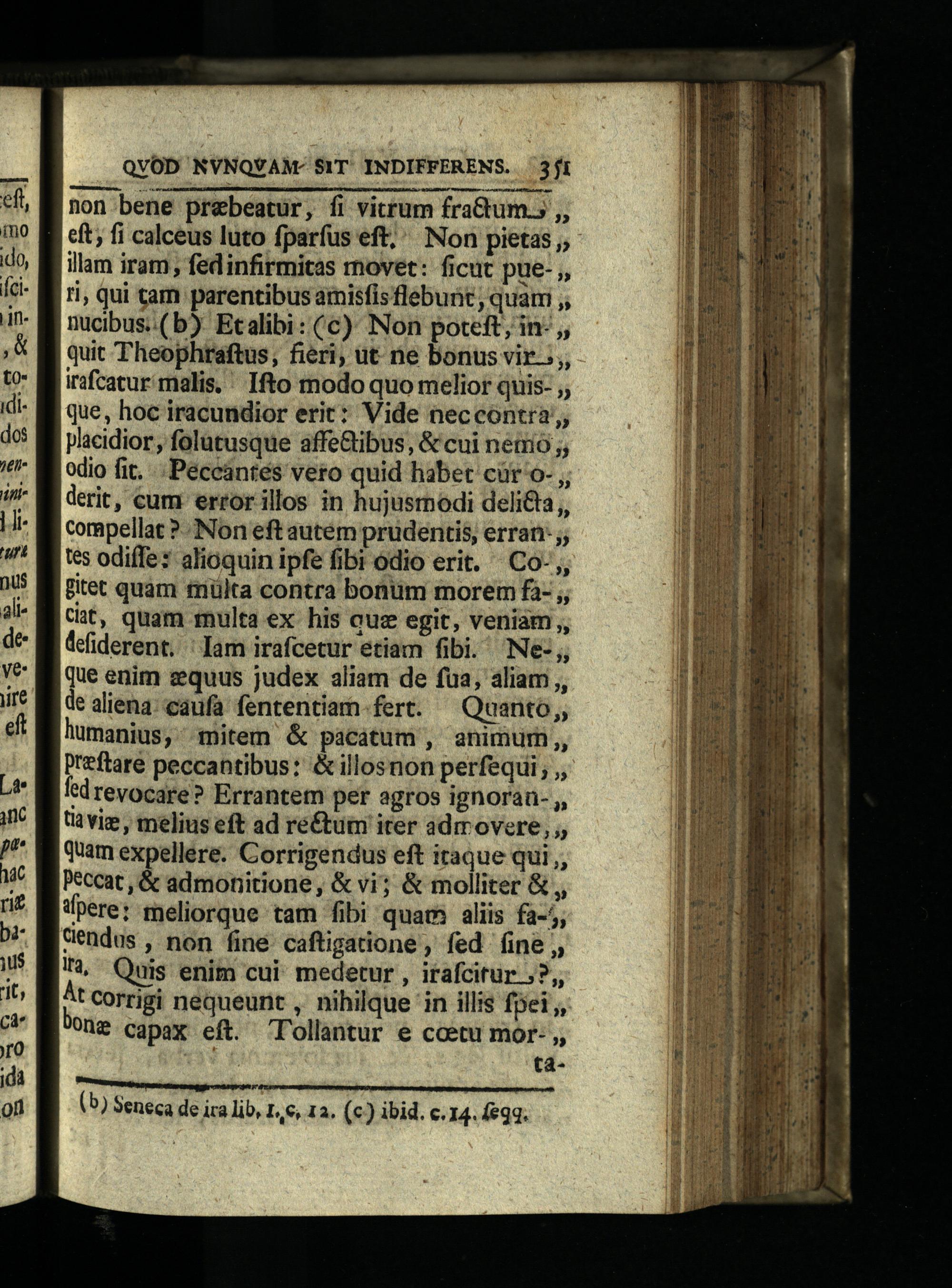 non bene prebeatur, fi vitrum fra&tum.; ,, eft; fi calceus luto fparfus eft; Non pietas ,; illam iram; fedinfirmitas movet: ficut pue-, ri, qui tam parentibus amisfis flebunit quami, nmucibus..(b). Etalibi:(c). Non poteft, in- ,, quit Theophraftus, fieri; ut ne bonus vir.5;, irfcatur malis.' Ifto modo quo melior quis-; que, hoc iracundior erit: Vide neccontrà;, placidior, folutusque affe&ibus,& cui nemo;, odio fit.-Peceantés vero quid habet cür o- ,, derit, cum error illos in hujusrmodi deli&ta,, compellat? Non eft autem prudentis, erran:;; tés odiffe: alioquin ipfe fibi odio erit.—Co- ,, Bitet quam tnülta contra bontm morem fa-, Cat, quam rmulta ex his cuz egit, veniam, &cfiderent. Jam irafcetur etiam fibi. Ne-,, que enim zequus judex aliam de fua, aliam, de aliena: caufa fententiam-fert.^ Quanto,, lumanius, mitem& pacatum, animum,, Preftare peccantibus:&illosnon perfequi, ,, ld revocare? Errantem per agros ignoraa- ,, üà vie, melius eft ad re&um iter admovere,, Quam expellere. Corrigendus eft itaque qui,, Peccat,& admonitione,& vi;& molliter& ,, (ere: meliorque tam fibi quam aliis fa-5, üendus, non fine caftigatione, fed fine, "4, Quis enim cui. medetur, itafcitur.;?,, t corrigi nequeunt, nihilque'in illis fpei ,,