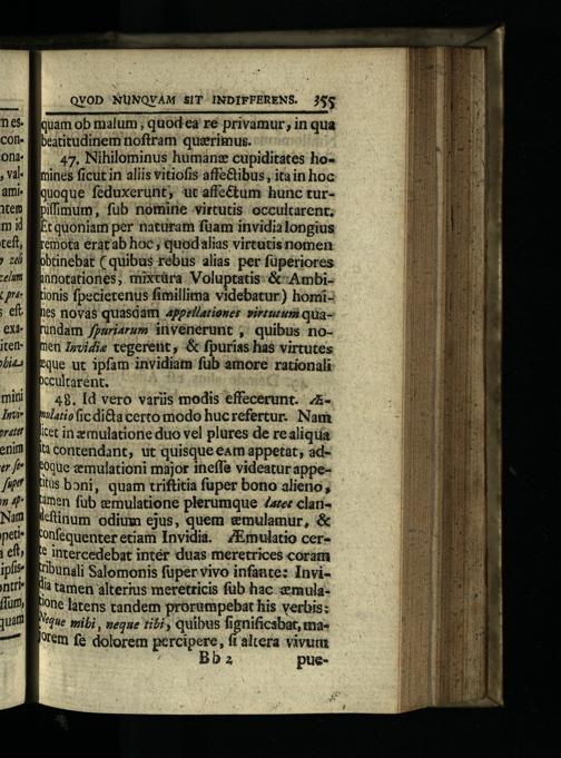 48. Id vero variis modis effecerunt. zz"latio fic diCta certo modo hucrefertur. Nam cet inzernulatione duo vel plures de re aliqua & contendant, ut quisque eAm appetat, ad« oque zemulationi major ineffe videatur appeIüs boni, quam rriftitia fuper bono alieno, àmen fub zemulatione plerumque Zzsee clan'cftinum odium ejus, quem emulamur,& Onfequenter etiam Invidià. ZEmulatio cer* intercedebat inter duas meretrices coram tibunali Salomonis füper vivo infante: Invi^ tamen alterius meretricis füb hac zemulanone latens tandem prorempebat his verbis:
