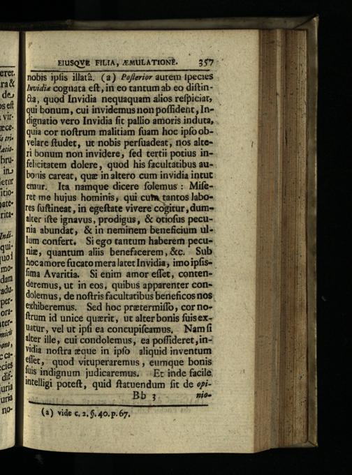 nobis ipfis illatà.(a) Poflerior autem tpecies Irvidie cognata eft, in eo tantum ab eo diftina, quod Invidia nequaquam alios refpicia qui bonum, cui invidemus non poffident, Indigaatio vero Invidia fic pallio amoris induta, quia cor noftrum malitiam fuam hoc ipfo obvelare ftudet, ut nobis perfuadeat, 10s alteri bonum non invidere; fed tertii potius infelicitatem dolere, quod his facultatibus aubonis careat, que inaltero cum invidia intut emur. Ica namque dicere folemus:. Miferet me hujus hominis; qui cut tantos labotes füftineat, in egeftate vivere cogitur, dumalter ifte ignavus, prodigus,& otiofus pecunia abundat,& in neminem beneficium ullum confert, Siego tantum habererh pecuni, quantum aliis benefacerem,&c. Sub. hocamore fucato mera latet Invidia, imo ipfis fima Avaritia. Si enim amor effet, contendéremus, ut. in eos, quibus apparenter condolemus, de noftris facultatibus beneficos nos. Cxhiberemus. Sed hoc pretermiífo, cor noftrum id unice quzrit, ut alter bonis fuisex"itur, vel ut ipfi ea concupifcamus, Namfi iter ille cui condolemus, ea poffideret ,in"dia noftra que in ipfo aliquid inventum eet," quod vituperaremus, eumque bonis füis indignum:judicaremus, Ec inde facile: intelligi poteft, quid ftatuendum fit de oziBb 3 nids
