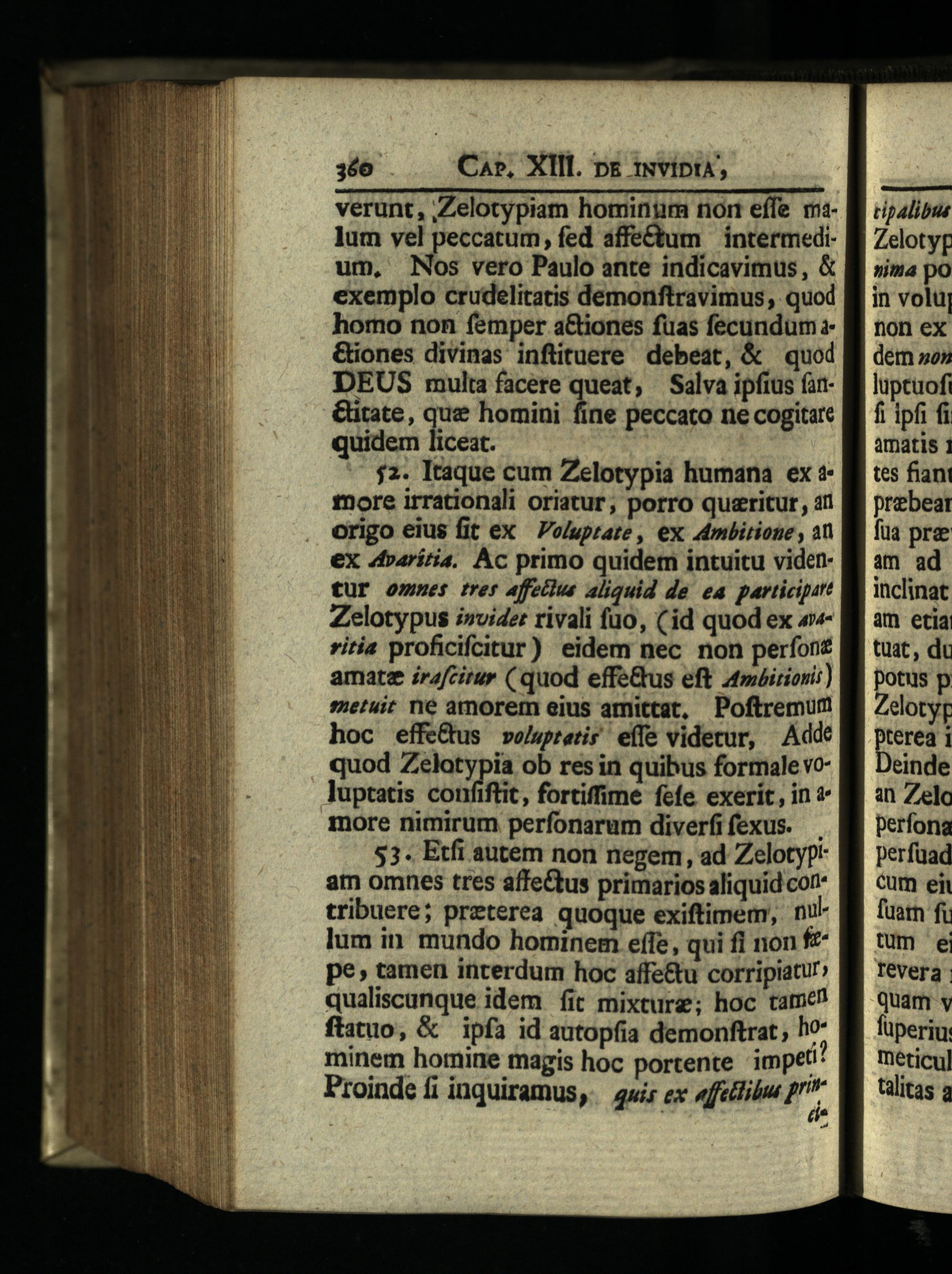 verunt, ,Zelotypiam hominum nor effe. malum vel peccatum, fed affe&um— íntermedium, Nos vero Paulo ante indicavimus,& exemplo crudelitatis demonftravimus, quod homo non femper a&iones fuas fecundum aGiones divinas inflituere debeat,& quod DEUS multa facere queat, Salva ipfius faaGitate, qui homini fine peccato ne cogitare quidem liceat. j2. Itaque cum Zelotypia humana ex* fnore irrationali oriatur, porro qusritur, at origo eius fit ex Po/upzate, ex AAmbitione, an ex«f»aríria, Ác primo quidem intuitu videntur omnes tres affectus aliquid de ea participar Zelotypus i»vider rivali fuo,(id quod ex a» vitia proficifcitur) eidem nec non perfont amate irafcirur(quod effe&us eft amábirioni:) metuit ne amorem eius amittat, Poftremum hoc effe&us»o/wptatir effe videcur, Adde quod Zelotypia ob res in quibus formale voluptatis confiftit, fortiffime fefe exerit, in* more nimirum perfonarum diverfifexus.. 53. Etfi autem non negem, ad Zelotyp': am omnes tres affe&us primarios aliquid con tribuere; preterea quoque exiftimem, nu lum in mundo hominem effe, qui fi non fz pe; tamen interdum hoc affe&u corripiatu qualiscunque idem fit mixture; hoc tame? ftatuo,& ipfa id autopfia demonftrat; ho minem homine magis hoc portente impet Proinde fi inquiramus,. uis ex afettibu Lid de