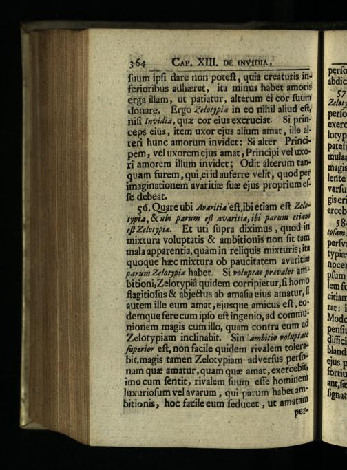 364. Car. XIII. DE INVIDIA,| faum ipfi dare non poteft, quia creaturis inferioribus adhzret, ita minus habet amoris erga illam, ut patiatur, alterum ei cor fuutri donare. Ergo Zelerjpia in eo miihil aliud eft, nifi Iyoidia, quz cor eiusexcruciat. Si princeps eiüs, item uxor ejus alium atnat, ille alteri hunc amorum invidet: Sialtér Principem, vel uxorem ejus amat, Principi vel uxori amorem illum invidet; Odit alterum tar. qvam furem, qui ei id auferre velit, quod pef imaginationem avaritiz fuz ejus proprium ef fe debeat. $6. Quare ubi 4rizia'eftibietiam eft Zelte 1ypia,&«bi parum eft avaritie ibi parum eiiam zfe Zelotypie. Et uti füpra diximus, quod i mixtura voluptatis& ambitionis non fit tam mala appárentia, quàm in reliquis mixtüris; it quoque hzc mixtura ob paucitatem avaritif parum Zelotypia habet.— Si voluptas praevalet amr bitioni,Zelotypià quidem corripietur, fi homo flagitiofus& abje&us ab amafía eius amatur," autem ille eum amat; ejusque amicus eft,€0 demque ferecum ipfo eft ingenio, ad comtnu nioriem magis cumillo, quam contra eum 3 Zelotypiam inclinabit. Sin Lambizio voluptat faperior eft, non facile quidem rivalem coler?* bicrnagis tamen Zelotypiam: adverfus perfe nam quz amatur,quam qui amat, exerceblo imo cum fentit, rivalem fuum effe homine" luxuriofum velavarum, qui parum habet am bitionis, hoc facile eum feducet, ut amitm P e