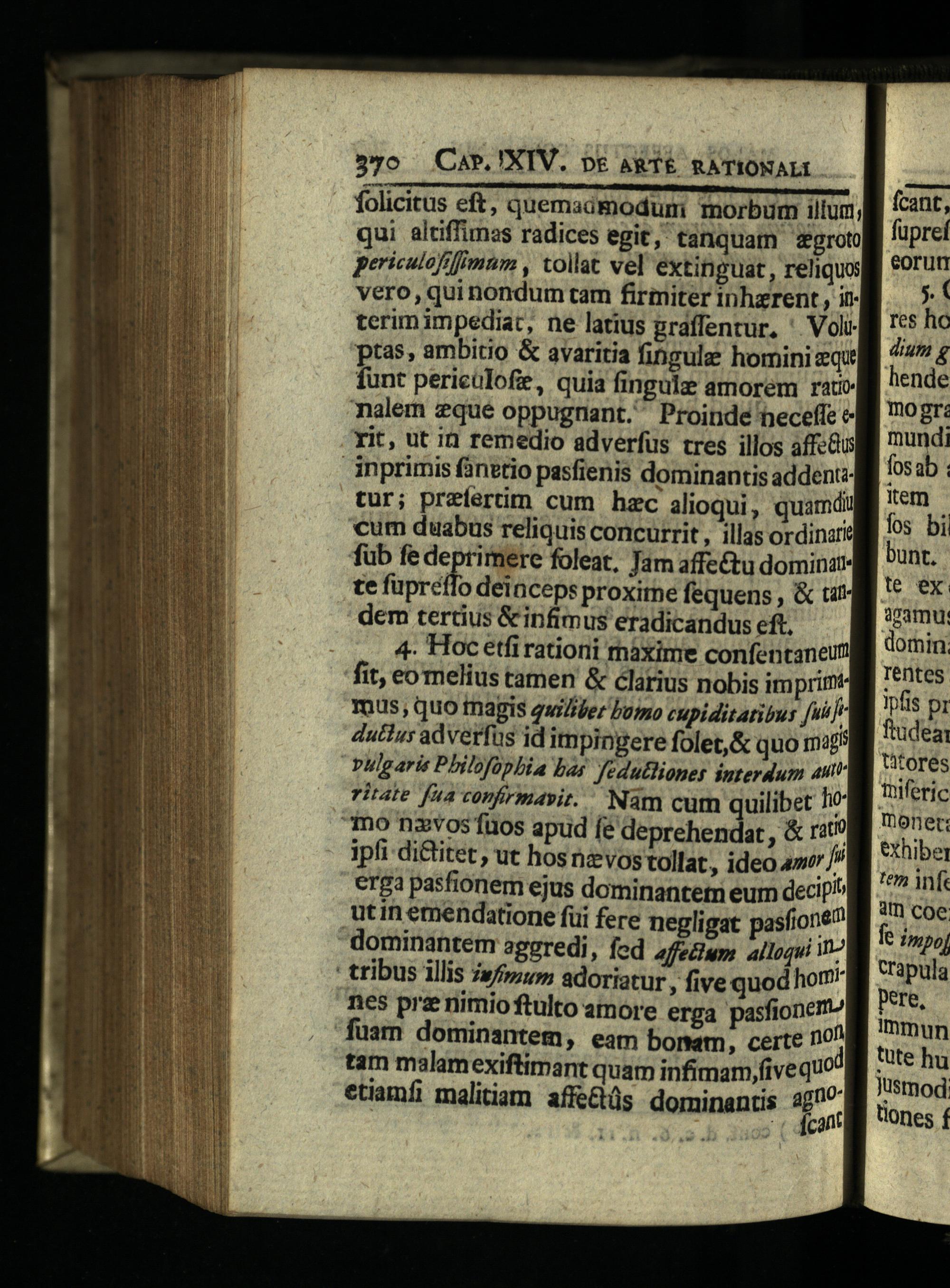 folicitus eft, quemaimodum: morbum ilium A(Cant qui altiffimss radices egit, tanquam gro lupret periculofifimum, tollat vel extinguat, reliquo Mi"orum vero, qui nondum tam firmiter inhzrent, it-;( terimimpediat, ne latius graffentur,' Volo gi 75 ho ptas, ambitio& avaritia fingule hominizqug^77 4 funt periculofie, quia fingulz amorem rao'ende Talem zque oppugnant." Proinde heceffe«gi"02r: Yit, ut in remedio adverfus tres illos affe&uggg undi inprimis finttio pasfienis dominantis adden: Mi 052b: tur; preíertim cum hzc alioqui, quamdulii em. €um duabus reliquis concurrit, illas ordinum o5. bi fub fe deprimere foleat, Jam affe&tu domina i^untte fuprefTo deinceps proxirne fequens,& uf'* 9x dem tertius&infimus eradicandus eft. bu 4. Hoc etfi rationi máxime confentanemill oin fit, eomelius tamen& clarius nobis imprimi 7*ntes mus, quo tnagis qwi/ler buo cupiditatibus[ui]u Ipfis pr dutius adverfus id impingere folet,& quo mags ftüdea vulg aris Pbilofophia bas fedutliones interdum M ores ritate fna confrmavit. Nam cum quilibet ho Tiferic "mo nxvos füos apud(e deprehendat,& rM 7 9^ec ipfi di&itet, ut hosnzvos tollat, ideo 4»/ M^"ibo erga pasfionem ejus dominantem eum decipi^^ nf tin emendatione füi fere negligat pasfione? i 77, oc dominantem aggredi, fed affetium. alloqui in e Tmpoj : tribus illis 2»/74» adoriatur, five quod hom" Crapula nes pra nimioftulto amore erga pasfionem^ pere, fuam dominantem, eam bonam, certe n^ mmn tam malamexiftimant quam infimam,five quo tte hu etiamfi malitiam affe&üs dominantis agno Nsmod z;.b duos( dC