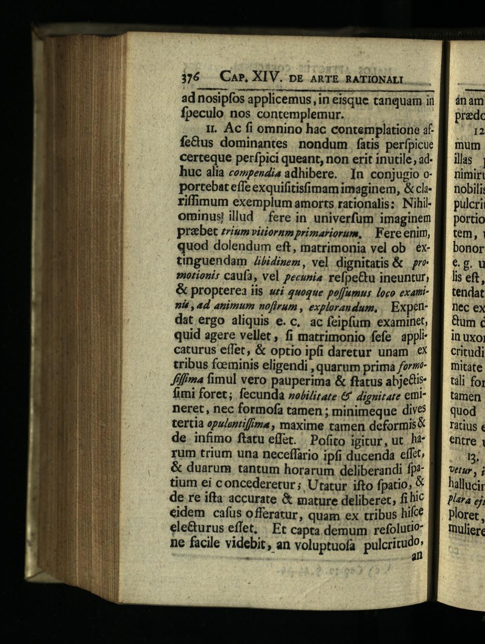 ad nosipfos applicemus, in eisque canquam in B ánam Ípeculo nos contemplemur. prede i. Ac fi omnino hac contemplatione f- 12 fe&us dominantes nondum. fatis perfpicue BB mum certeque perfpici queant, non erit inutile, ad- M illas; huc alia co»pendia adhibere. In conjugio o- BÍ nimiri portebat efTe exquifitisfímam imaginem,&cl- lE nobili riffimum exemplum amorts rationalis: Nibi- B pulcri ominus) illud fere in univerfum imaginem BM portio prebet zriumvitiornmprimariorum, Fereenim, Bi tem,: quod dolendum eft, matrimonia vel ob éx- Bl bonor tinguendam Ji/idizem, vel dignitatis& 9^ M e.g. u morionis caufa, vel pecusia refpe&u ineuntur, B lis eft, & propterea iis ui 4uoque poffumus loco exami- M tendat nis ad animum noftrum, explarandum,| Expet- lE nec ex dat ergo aliquis e. c. ac feipfum examine, Bl Gum c quid agere vellet, fi matrimonio fefe appli BP inuxo caturus effet,& optio ipfi daretur unam c M critudi tribus fceminis eligendi, quarum prima fzr/^ WE mitate Jif/ma fimul vero pauperima& ftatus abje&is- BI tili foi funi foret; fecunda»o/i/itare 6 dignitate emi" MI tamen neret, nec formofa tamen; minimeque divó B quod tertia epulsntif/ma, maxime tamen deformis BI rarius c de infimo ftatu elfet.| Pofico igitur, ut hi M entre rum trium una neceffario ipfi ducenda efft M.. 5. & duarum tantum horarum deliberandi fp BI vec,; tium ei concederetur; Utatur ifto fpatio,* M hillucir de re ifta accurate& mature deliberet, fihic BI pea s; eidem cafus offeratur, quam ex tribus li ME Plorer, ele&urus effet,| Et capta demum refoluti" MI mulier