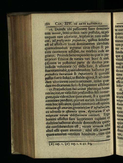 16. Deinde ubi paffionem fuam dominan. tem invenit, boni ordinis ratio poftulat, ut priusquam eam adoriatür, feipfum in tuto collocét, ad profiranda. prajudicia, quibus fedu&us eft ad affeétum fuum dominantem alendum quemadmodum zgrotus circa cibum& pocum cautionem adhibet, ne morbus inde augeatur, Proinde beneexpendet ea que in parte priori Ethices de natura veri boni& mali, (d)item in pofteriori parte de duobus pr&judiciis voluntatis(e) di&a func,& a&iones fuas examinabit, quemadmodum ha&enus per préjudicia Imitationa& Impatientie fe quotidie páftus faerit feduci, ut ftolide ageret,& ad vicandam ulteriorem continuationem, utiles quas dam meditationes ferio& frequenter adhibeat