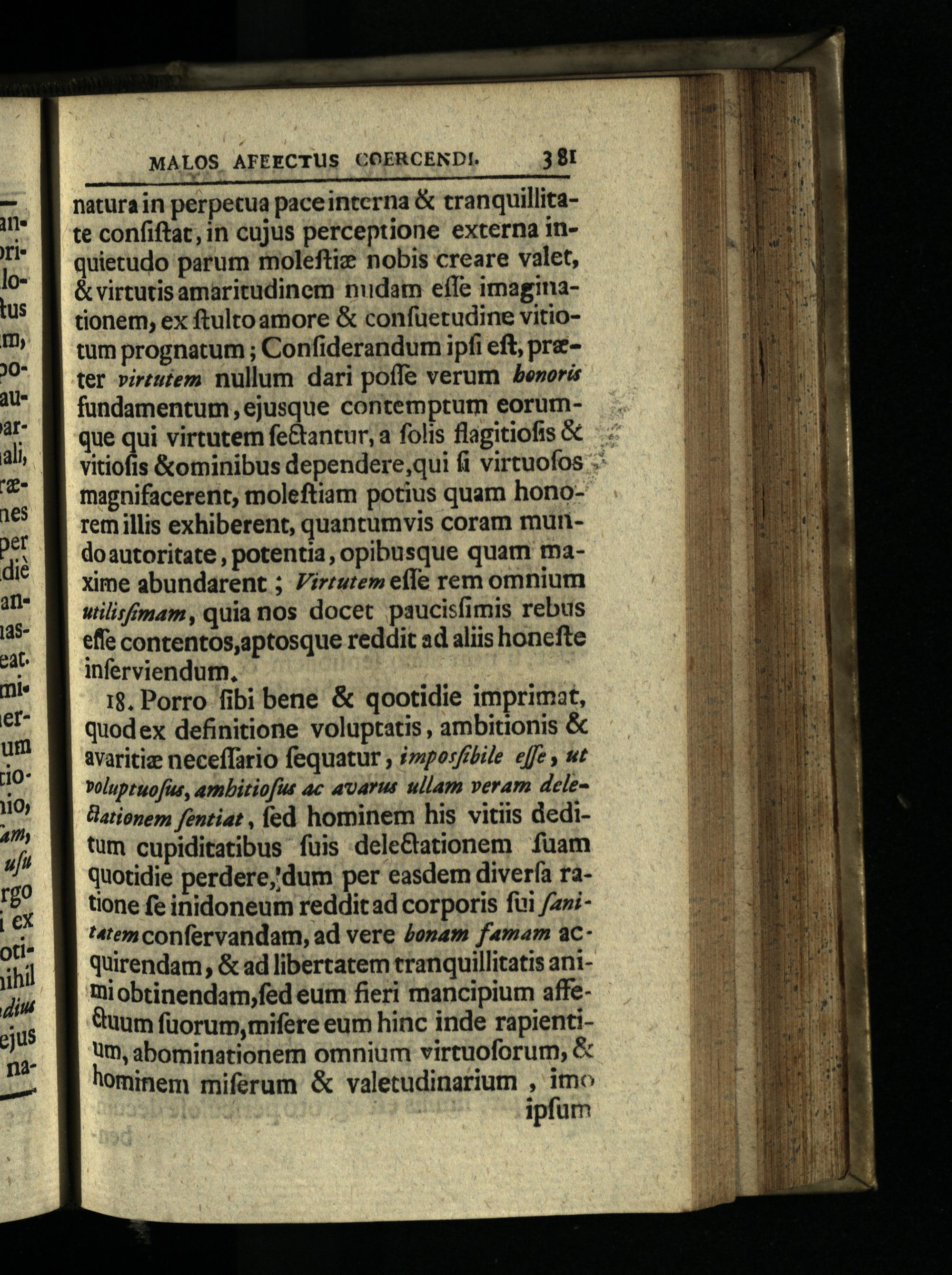 inferviendum, i$. Porro fibi bene& qootidie imprimat, quodex definitione voluptatis, ambitionis& avaritig neceffario fequatur;;»posfbile effe y ut voluptuofus, ambitiofus ac avarus ullam veram deleBationem féntiat, fed hominem his vitiis deditum cupiditatibus fuis dele&ationem fuam quotidie perdere,dum per easdem diverfa ratione fe inidoneum reddit ad corporis fui /azitatem confervandam, ad vere£opap famam acquirendam& ad libertatem tranquillitatis animiobtinendam,fed eum fieri mancipium affeuum füorum,mifere eum hinc inde rapientium, abominationem omnium virtuoforum,& ominem miferum& valetudinarium, imo ipfum