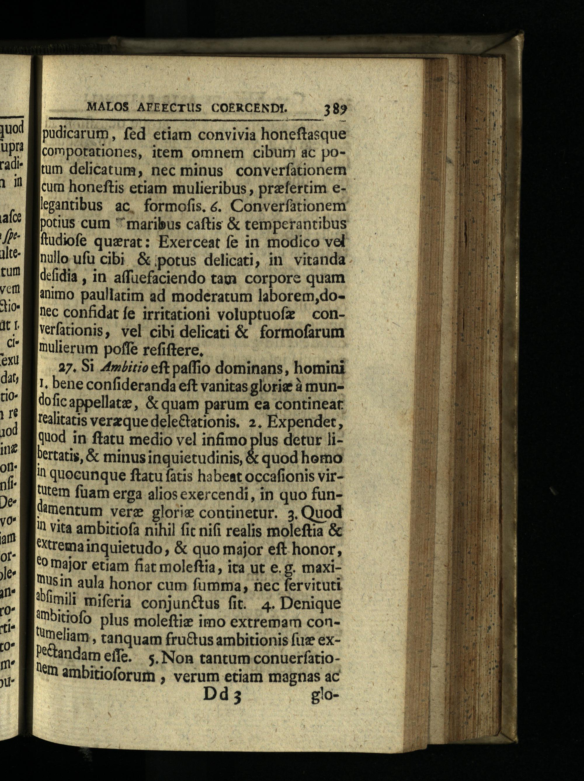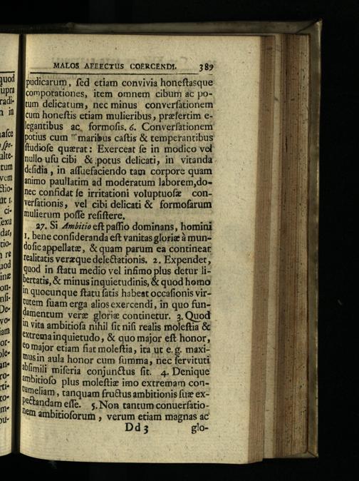 pudicarum, fed etiam convivia honeftasque comporationes, item omnem cibum ac potum delicatum, nec minus converfationem cum honeftis etiam mulieribus, prefertim elgantibus ac, formofis.€. Converfationem potius cum"^ maribus caftis& temperantibus ftudiofe querat: Exerceat fe in modico vel nullo ufu cibi&;potus delicati, in vitanda defidia, in affuefaciendo tam corpore quam animo paullatim ad moderatum laborem,dolec confidat fe irritationi voluptuofz—conVerfationis, vel cibi delicati& formofarum mulierum poffe refiftere, 27. Si 4mlitio eft paffio dominans, homini 1, bene confideranda eft vanitas glorie à mundoficappellatz,& quam parum ea contineat tealitatis vereque deleGtationis. 2. Expendet, quod in ftatu medio vel infimo plus detur libertatis,& minusinquietudinis,& quod horno I1 quocunque ftatu fatis habeat occafionis virutem fuam erga alios exercendi, in quo fundimentum verz glorie continetur. 3. Quod 11 vita ambitiofa nihil fic nifi realis moleftia& "trema inquietudo,& quo major eft honor, to major etiam fiat moleftia, ita ut e.g. maxi"sin aula honor cum fumma, nec fervituti "mili miferia conjun&us fit. 4. Denique imbitiofo plus moleftiz imo extremam contmeliam, tanquam fru&tus ambitionis fuz exWandam effe. 5. Non tantum conuerfatiolem ambitioforum, verum etiam magnas ac Dd; glo