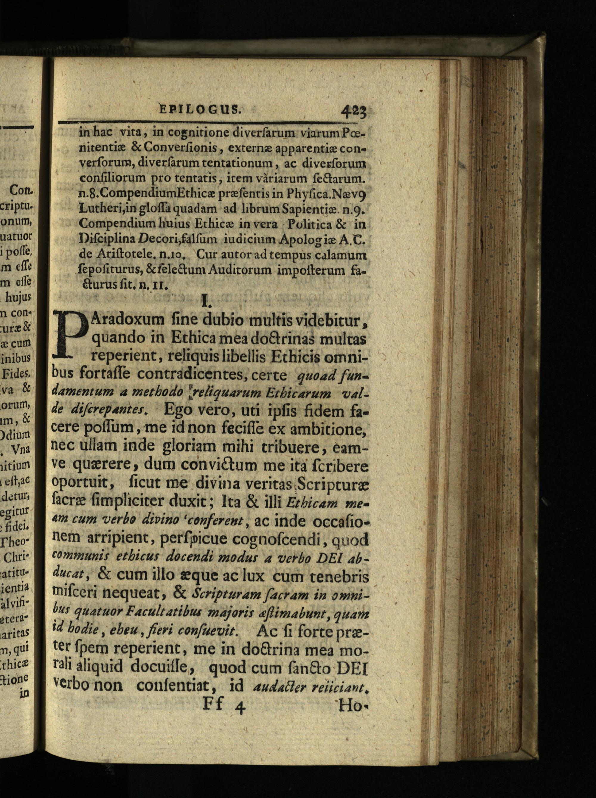 inhac vita, in cognitione diverfarum: viarum Poc-nitentie& Converfionis, externe apparentic con» verforum, diverfarum tentationum, ac divezforum confiliorum pro tentatis, item vàáriarum feCtarum. n.8.CompendiumEthice przfentis in Phyfica.Na2v9 Lutherijin gloffà quadam ad librum Sapientic. n.9. Compendium huius Etbice in vera Politica& in Difciplina Decori falfum iudicium Apologiz A.C. de Arifítotele, n.1o, Cur autorad tempus calamum fcpofiturus,&fele&um Auditorum impolterum£faGurus fit, n, 11, Tg