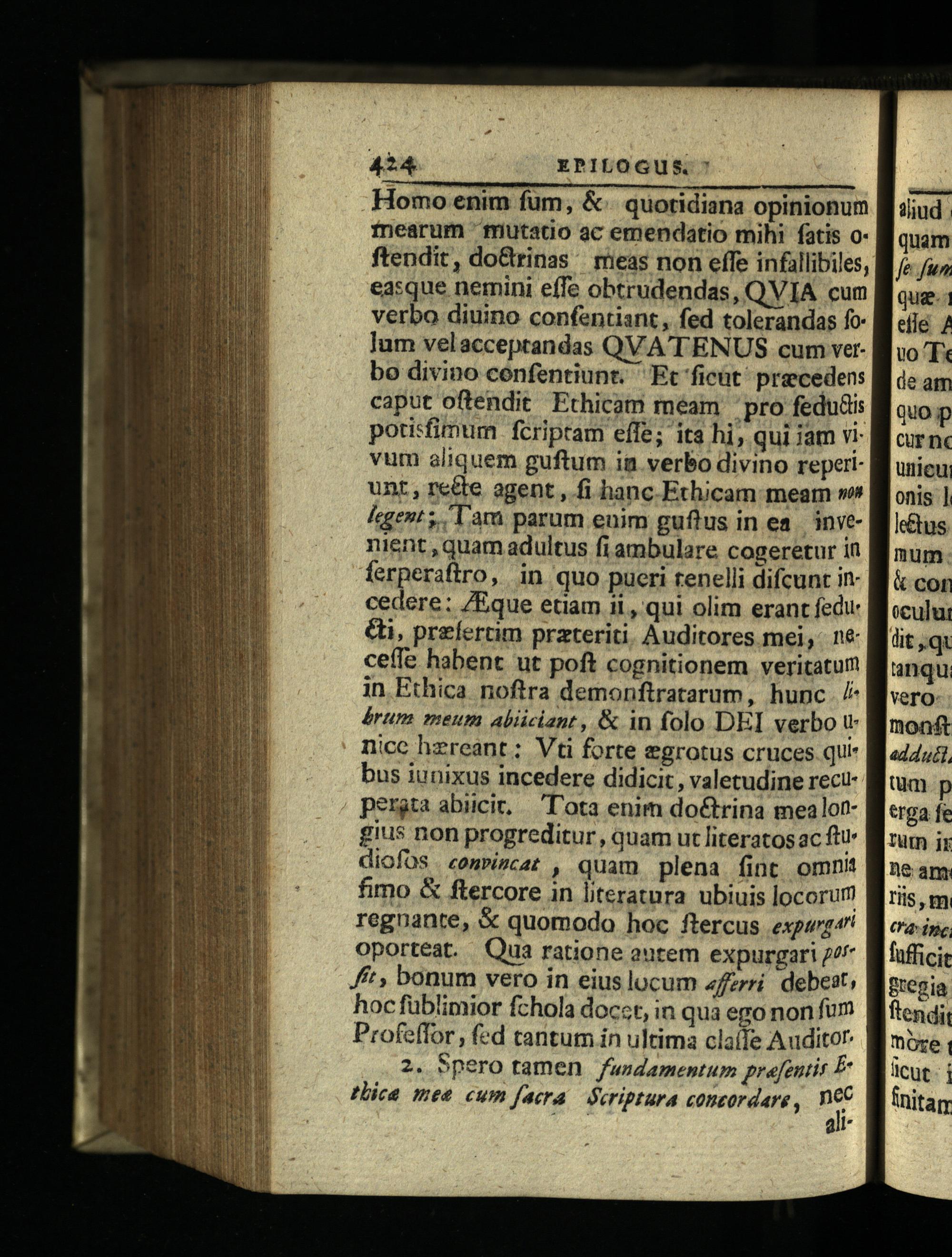 Homo enim fum,&. quotidiana opinionum fnearum"mutado ac emendatio mihi fatis oftendit, doGrinas' meas non effe infillibiles, easque nemini effe obtrudendas, QVIA cum verbo diuino confentiant, fed tolerandas folum velacceptandas QVATENUS cum verbo divino confentiunt. Et ficüt' praecedens caput oftendit Ethicam méam pro fedu&is potisfimum fcriptam effe; its hi; qui jam vivum aliquem guftum ia. verbo divino reperiunt, re&te agent, fi hanc Ethicam meam v legent,"lara parum enim guflus in ea inyenient, quam adultus fi ambulare cogeretur i ferperafiro, in quo pucri tenelli difcunt incedere: ZEque etiam ii, qui olim erant fed Gi, przfertim przteriti. Auditores mei, n& ceffe habent ut poft cognitionem veritatum in Ethica noftra demonftratarum, hunc. /brum meum abüciant,& in folo DEI verbo ü nicc hzreant; Vti forte egrotus cruces qui. bus iunixus incedere didicit, valetudine recipergta abiicir,.'T'ota enim do&trina mealorgius non progreditur, quam ut literatosac ftw diofüs compiscat, quam plena fint omnit fimo& ftercore in literatura ubiuis locorum regnante,& quomodo hoc ftercus exper oporteat. Qua ratione autem expurgari //" ^, bonum vero in eius locum«feri. debeat; hoc füblimior fchola docct, in quà ego non fum Profeffor, fed tantum in ultima claife Auditor