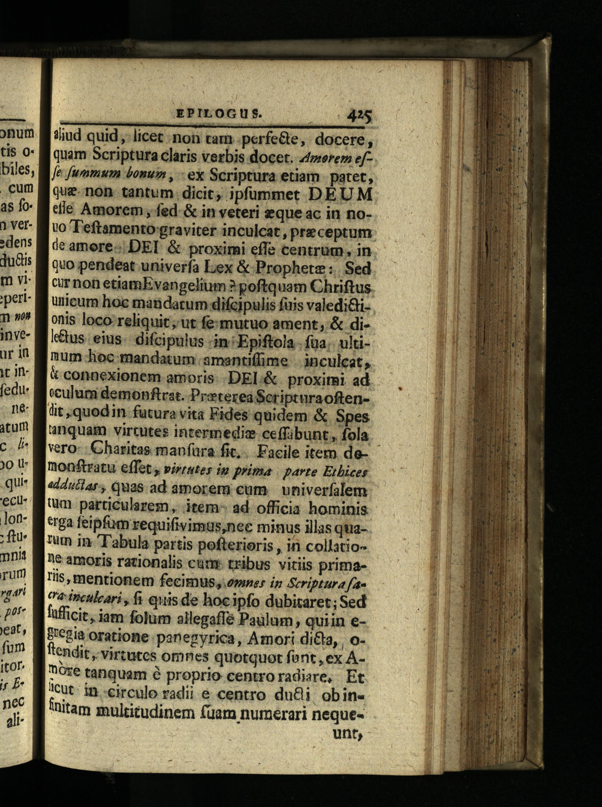 liiud quid, licet non tam.perfe&ie,: docere, quam Scriptura claris verbis docet. 4morem e/[e fummum bonum,- ex Scriptura etiam patet, que.non tantum. dicit, ipfummet DEUM ele Amorem, fed& in veteri zque ac in novo T'eftamento graviter inculcat, preceptum. de amore: DET& proximi effe centrüm. in quo pendeat univerfa Lex& Prophete:. Sed Qrnon etiamEvangelium? poftquam Chriftus. unicum hoc mandatum difcipulis fuis valedi&ionis loco: reliquit, ut fe-mutuo ament,& dik&us eius: difcipulus in: Epiftola. faa. ultinum hoc mandatum amaentifime| inculcat, & connexionem amoris..DEI.& proximi ad culum demonftrat. Preterea Scripturaoftenlit quodin futura vita Fides quidem& Spes unquam virtutes intermediz ceffibunt, fola vero: Charitas manfura fic,.. Facile item. demonftratu effet y vireutes ip prima| parte Ethices 4lduilar, quas ad amorem eum. univerfalem üm particularem, item- ad officia hominis trga feipfum requifivimus,nec minus illas quatum in"Tabula partis pofterioris, in collation6 amoris razionalis curm. tribus vitiis prima"i5, mentionem fecimus, omne: in Scriptura fao ca inculcari, fi quis de hocipfo dubitaret; Sed ufficit, iam folum allegaffé Paulum, quiin€Stegia oratione panegyrica, Amori di&a,| o
