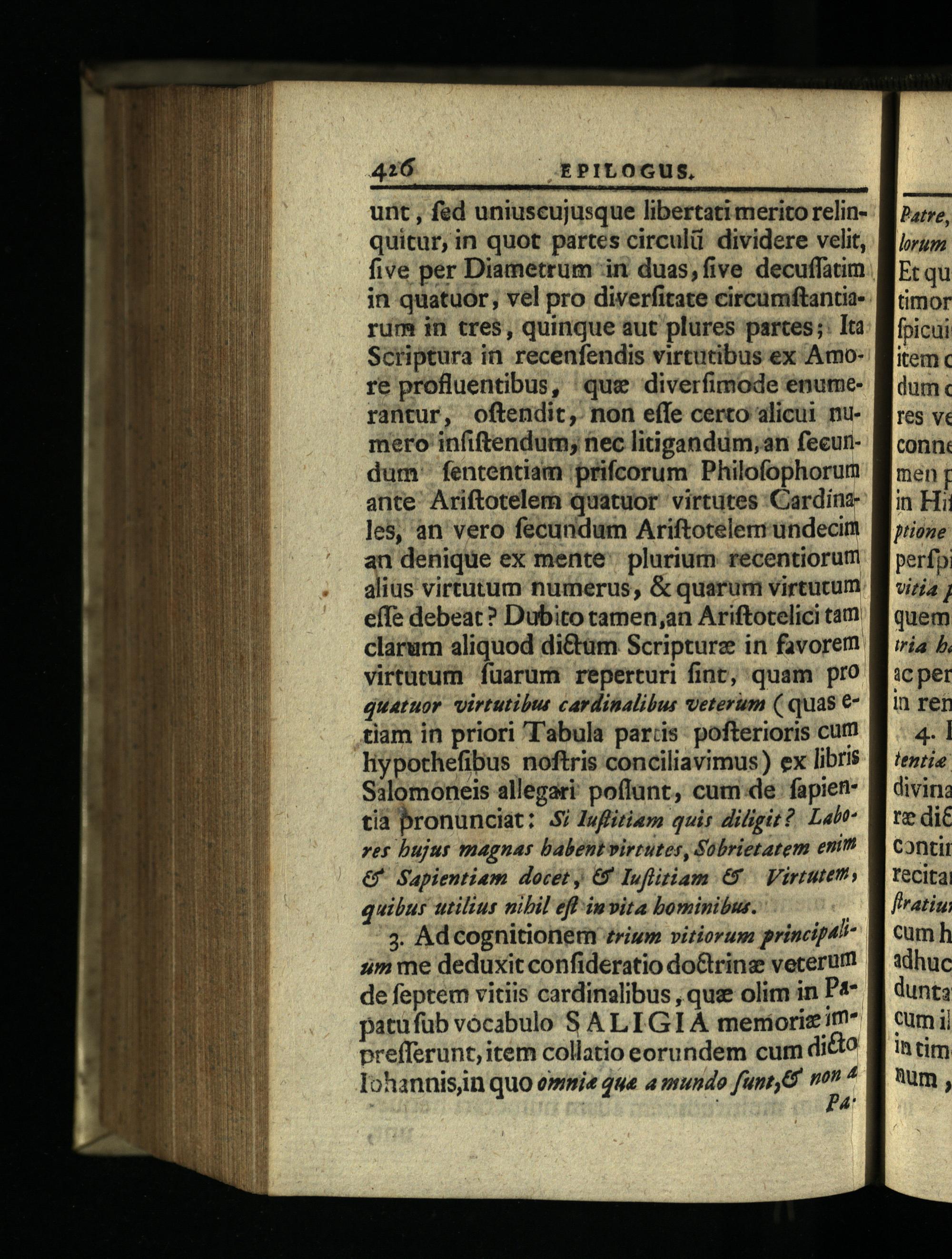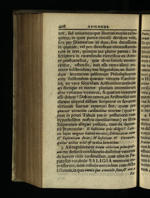 rum in tres, quinque aut plures parces; Ita Scriptura in. recenfendis virtutibus ex Amore profluentibus, que diverfimode enumerantur, oftendic,. non effe certo alicui numero infiftendum; Rec litiganduüm,an fecundum fententiam prifcorum Philofophorum ante Ariftotelem quatuor virtutes'Cardinz les, an vero fecundum Ariftotelemundecim an denique ex mente' plurium récentiorum alius virtutum numerus,& quarum virtucum effe debeat? Dubito tamen;an Ariftotelici tam clarum aliquod di&um Scripture in favorem virtacum fuarum reperturi fint, quam pro quatuor. virtutibus cardinalibus veterum( quas€ tiam in priori"Tabula parcis pofterioris cum liypothefibus noftris conciliavimus) ex libris Salomoneis allegari poflunt, cum:de fapientià Pronunciat:.$/ lufitiam quis difigit? Labeves bujus magnas babentpirrutes, Sobrietatem emm € Sapientiam docet)& Iuflitiam€5| Virtutem, quibus utilius nibil eff iuvita bominibus. 3. Ad cognitionem zriup vitiorum princip4lzm me deduxit confideratio doGtring veterum de feptem vitiis cardinalibus, que olim in Pe patufüb vocabulo SALIGIA menioriz ifm prefferunt, item collatio eorundem cum dicto Iohannisiin quo owmnie que a mundo funt, icon