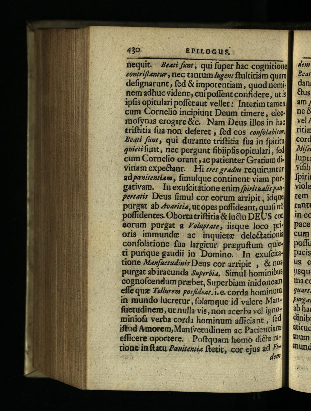 nequit.— Beari fuzr, qui fuper hac cognitione . 4oniriffantur ,nec tantum Zugen: ftultitiam quam defignarunt, fed& impotentiam, quod nemi nem adhuc vident, cui poffent confidere, utis ipfis opitulari poffetaut vellet: Interim tamen cum Cornelio incipiunt Deum timere, eleemofyuas erogare&c. Nam Deus illos in hac triftitia fua non deferet, fed eos confolabitr Beati fut, qui durante triftitia fua in fpiriti quieti fünt, nec pergunt fibiipfis opitulari, fcd cum Cornelio orant, ac patienter Gratiam divitiam expeCtant. Hi zrer gradu requiruntur ad penitentiam, fimulque continent viam purgativam. Inexufcicatione enim Jpiritualis pav pertatis Deus fimul cor eorum arripit, idque purgat ab 4varizi, ut opes poffideant, quafi nó poffidentes. Obortatriftitia& lu&u DEUS cor éorum purgat a 7oe/zrate, iisque loco prr: oris immundze ac inquiete delectationis confolatione fua largitur: preguftum. quie ti purique gaudii in Domino. In exuícit tione Ma»fuerudinis Deus cor arripit,& nos purgat abiracunda 5zperlia, Simul hominibus cognofcendum prebet, Superbiam inidoneam effe que Teurem posfídear.3. e. corda hominum in mundo lucretur, folamque id valere Ma'füetudinem, ut nulla vis, non acerba vel igno miniofa verba corda hominum afficiant, fe iftud&morem,Man(vetudinem ac Parientiam efficere oportere.. Poftquam homo dicla? tione inftatu Papizer;ie ftetit, cor ejus ad za