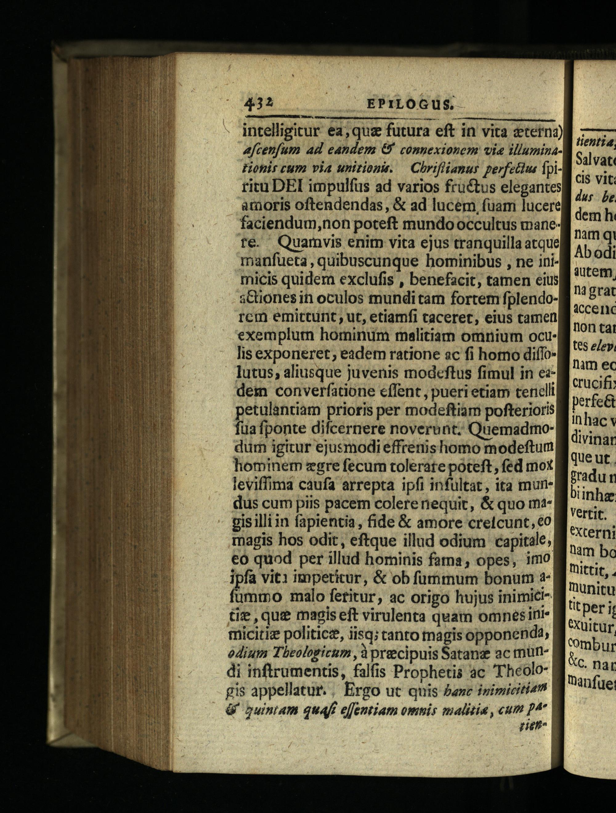 intelligitur ea; quz futura eft in vita zternz) afcenfum ad eandem& connexionem via illuminaHonir cum via unitions.— Chriflianus perfetlus fpiritu DEI impulfus ad varios fructus elegantes atüoris oftendendas,& ad lucem, fuam lucere faciendum,non poteft mundo occultus manete. Quamvis enim vita ejus tranquilla atque manfueta, quibuscunque bominibus, ne inimicis quidem exclufis, benefacit, tamen eius sCüiones in oculos mundi tam fortem fplendorcm emittunt, ut, etiamfi taceret, eius camen exemplum hominum malitiam omnium ocu. lis exponeret; eadem ratione ac fi homo diífolutus, aliusque juvenis modeftus fimul in ezdem converfatione cffent, pueri etiam tenclli petulantiam prioris per modeftiam pofterioris fua fponte difcernere noverunt. Quemadmodum igitur ejusmodi effrenis homo modeftum hominem zgre fecum tolerate poteft, fed mox leviffima caufa arrepta ipfi infultat, ita mundus cum piis pacem colerenequit,& quo m4gisilli in fapientia, fide& amore cretcunt,€o magis hos odit, eftque illud odium capitale, €ó quod per illud hominis fama, opes, imo ipfa vit1 impeticur,& ob fummum bonum 1 nO malo fetitur, ac origo hujus inimici"