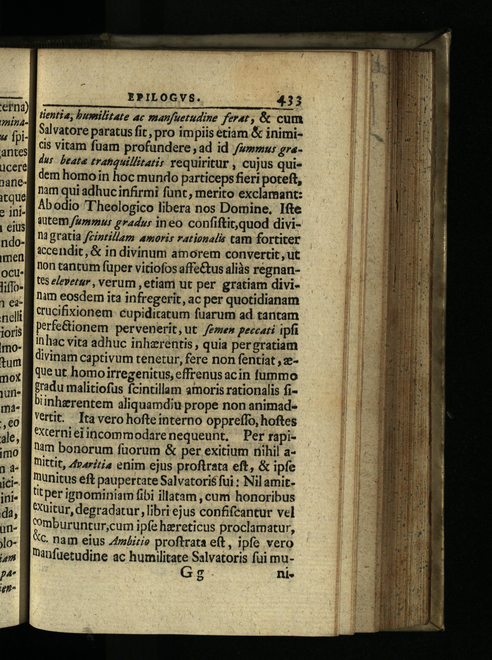 tientia, bumilitate ac manfuetudine ferat,& cum Salvatore paratus fit, pro impiis etiám& inimicis vitam fuam profundere, ad id /z»mws gradus beata tranquillitatis requiritur, cujus qui« dem homo in hoc mundo particeps fieri poteft, nam qui adhuc infirmi fant, merito exclamant: Abodio'T'heologico libera nos Domine, Ifte autem amus gradus ineo confiftitquod divina gratia /cintillam amoris rationalis cam fortiter &ccendit,& in divinum amorem convertit, ut non tantum fuper vitiofos affe&tus aliàs regnant$ eleverur, verum, etiam ut per gratiam divi1m eosdem ita infregerit, ac per quotidianam cucifixionem: cupiditatum fuarum ad tantam perfe&ionem pervenerit,ut /eme» peccati ipfi In hac vita adhuc inhzrentis, quia pergratiam divinam captivum tenetur, fere non fentiat zeque ut homoirregenitus, effrenus acin lummo gradu malitiofus fcintillam amoris rationalis fibiinherentem aliquamdiu prope non animad Vertit. Ttavero hofte interno oppreffo, hoftes *ternieiincommodarenequeunt,' Per rapinam bonorum füorum& per exitium nihil aittit, 44r/;ia enim ejus proftrata eft,& ipfe munitus eft paupertate Salvatoris fui: Nil amitütper ienominiam fibi illatam, cum honoribus &uitur, degradatur; libri ejus confifcantur vel mburuntur,cum ipfe hereticus proclamatur,