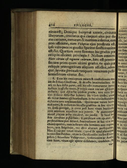// 6. Ecce hic conceptum meum& confesfionem meam de Ethica Chriftiana,& de o&o beatitudinibus, Et uti ex late di&is patet, etfi hico&o numerantur beatitudines 7 effefa tamen Q7 reipfa unam tautum effe beatifndimem: qui diflin'fos quidem gradus, non vero fp cies realiter diftin&as habeat; ita etiam credo, qa du taxat borninis effe beatitudiuem, in bac vita inéboandath in futura vero confumandam.| Quicunque veram beati* tudinem;& nullum ex his o&o gradibus in hac vita Yi vo fenfü.percipit, is certe poft hanc vitam beatitudinem eternam expectare non poterit, 7 quanmcunqi mundi plagam arbor cecideyit, ita jaceliz, Si beati tr bem terrarum peffidebunt, 6 pácificare eos oportet f perfecutionem pati debent, beatitudinem id hac vira i choari oportet, nam in futura vita homines non regn? bunt, non litigabunt, nec alter alterum perfequetur. Hinc fi quis per totam vitam;( quod fit apud plerosque in omnibus ftatibus, etiam in Chriftianifo no&ro Evan" £elico) fecundum Voluptatem, Ambitionem ac Avati* tiam fuam, vitam egit aperte diffolutam, crudelem;