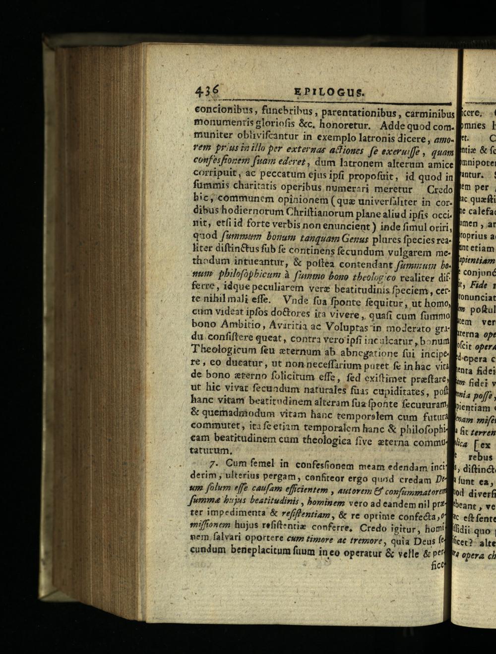 thodum intueantur,& poftéa contendant fumum be. mum. philbofopbicum à fummo bono£heolog/co realiter dif fecre, idque peculiarem vere beatitudinis fpeciem, certe nihilmalieffe. Vnde fua fponte fequitur, ut homo ciim videat ipfos do&ores ita vivere, quafi cum fummo bono Ambitio, Aviriria ac Voluptas'in moderato gr: du confiftere queat, contra vero ipfi incalcatur, bonum T'heologicum feu eternum ab abnegatione fui incipe. re, eo ducatur, ut non neceffirium putet fe inhac vin de bono eterno folicitam effe, fed cxiftimet preeftare ut hic vivat fecundum naturales fuas cupiditates, pofi hanc vitam beatitudinem alteram fua fpo