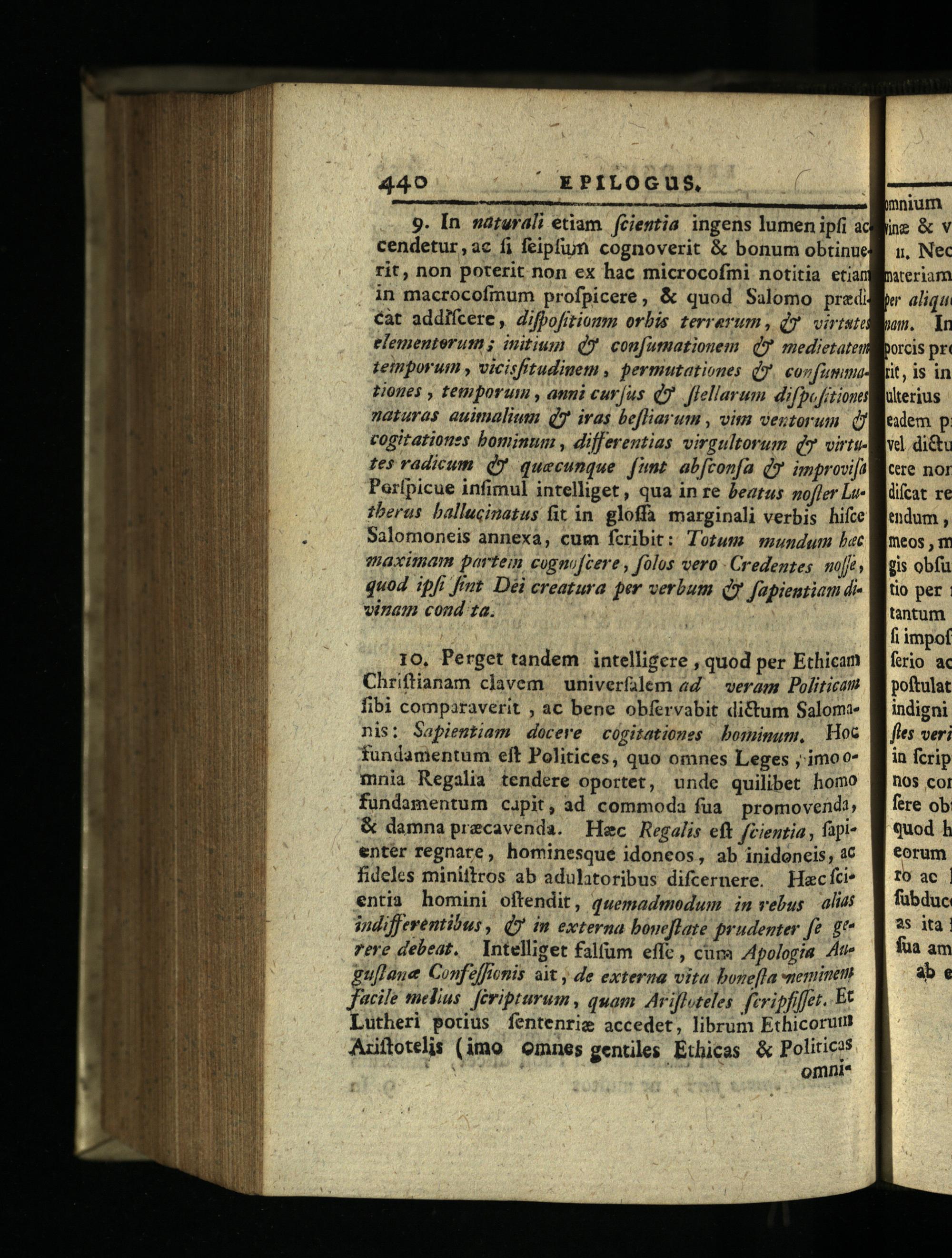 10, Perget tandem intelligere, quod per Ethican Chriflianam clavem univerfülem ad. veram Politicam fibi comparaverit, ac bene obfervabit dictum Salome nis: Sapientiam docere cógitationes. bominum,| Hoc fundamentum eft Politices, quo omnes Leges;'imoomnia Regalia tendere oportet, unde quilibet homo fundamentum capit, ad commoda fua promovendi & damna precavenda. Haec Regalis eft fcientia, fapientér regnare, hominesque idoneos, ab inidoneis, ac fideles miniftros ab adulatoribus difcernere. Hac fcie entia homini oftendit, quemadmodum in rebus. aliis indifferentibus, QY im externa bomelate prudenter fe. gt rere debeat,— Intelliget falfum eflc, cum Apologia At gullane Confzffronis ait, de externa vita bore[la veninet Jacile melius.[eripturum, quam Ariftoteles feripfifet. Et Lutheri potius fentenrie accedet, librum Ethicorum Aziftotelis(imo Omnes gentiles Ethicas& polices F MA d omni