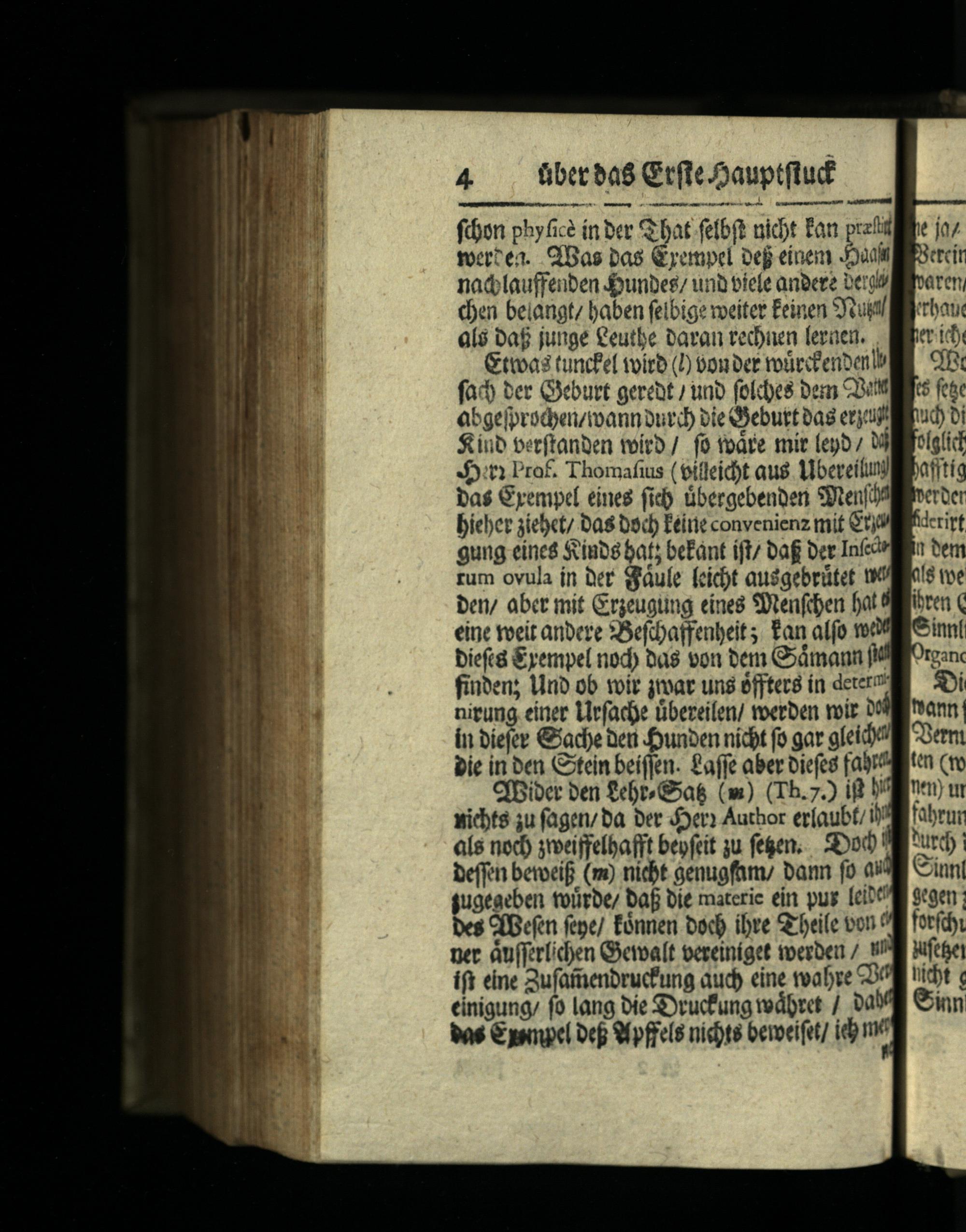 4. fiber ba Crtfte.oauptfiud fijon phyfic in ber S bat fefbft nicbt fan preti woer^ea. QBas bas Gyempel Def einem JoonW nadbltauffenben Syunbes/ unb bíele anbere bero» den belangt, baben fetbige meitee einen SYeugtl aló bag junge Ceutbe Daran red)nen feraet.. G&ttoa3 tuncfef toírb(D) 0n ber voir cPenben lb fad) ber Geburt gereat/ unb folcdes bem QM abgefprodyenzmannurd) bie Geburt bas ety! $iub becftanben tvírb /. fü fodre mir(epb/ D iti Prof. Thomafus( eitleict au$. Mbereifung Dba$ Gyempel eineg fid) tübergebenben SDtenfdf bieber 3íebct; Das bod) Etitie convenienz mit€t) gung eine$ Stiubs bat; beEant ift bag Der Infcó rum ovula ín bet Sue(cic)t ausgebrütot mic ben/ abct mit Grgeuging eines 9Doenfiben fot 9 eine tveit anbere SBefdoatfenbeit s; Fan alfo von biefta£yempel nod) ba$ von bem Godmann f finben; 1nb ob toir jtmar uns éfftec8 in detero" nigung einer Llrfade übereilen/ toerben voir 009 ín biefee&adje bed ounben nidbt fo gar fcio M" bic in ben tein beiffen.£'affe aber biefeg fagi? CfBiber ben ferG»a&(wm)(Th.7.) ig VV wicbt$ u fagen/ba ber oer Author er(aubt/ iM as nod) smveiffelbafft bepfeit gu fegen,| Dod! beffen bevoeif(m) nidbt aenugfam/ bam fo a9 $ugtaeben tolirbe/ baf bie materie ein pur[cio bes CBefen fepe/ Eónnen Dod) ibre Qr beile von ner. áu(ferlid)en Gea[t ocreiníget werben/ w ift eine 2ufafmenbrucfung aud eine teafyre 2X einigung/ fo lang bie Sorucfung redpret/ 09^ bo$&yempel Def fpffels nid)te beroeifet/ i) mo