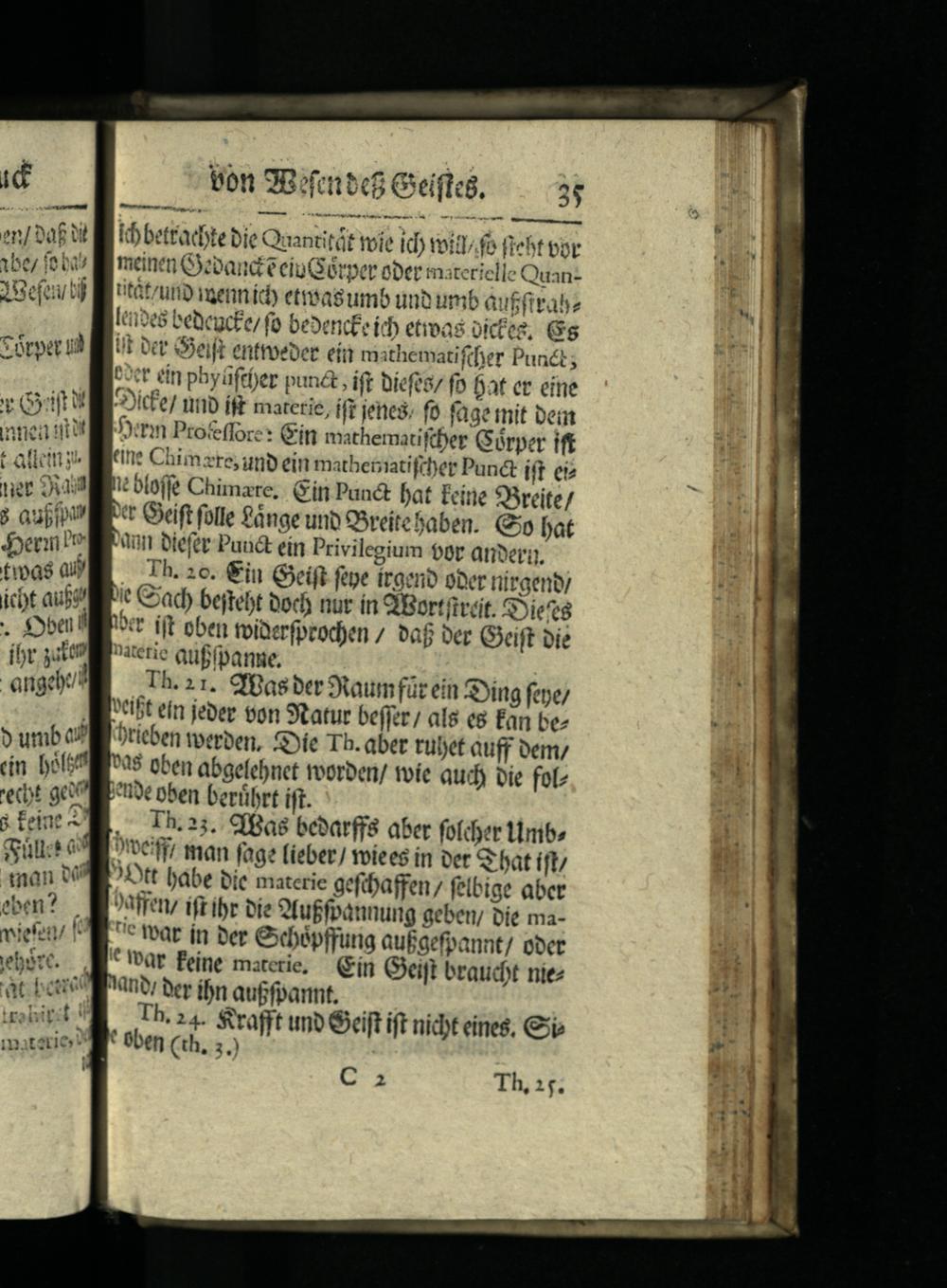 Ib bettacbte bie Qaantitát tie id) roitlfe fiebt vor meine Geboand'e eiuGérper ober matericllc Quanit&t/utio veenníd) etmsasumb unb umb auffitabe lcioes bebcucfe fo bexenc£: ích etivas oictee, Gs üt Det Gleijt entroeDet eit mathemati fcber Punct; bt ein phyüftf)ey pun, ift biefes fo bat et eine "lcle/ nnb fft materie, ift jenes; fo fage tnit beim Jn Profeffore: Gin mathematiftber Gérper ift ene Chimzre, unb ein matbebiatifcber Punct ift ei n bloffe Chimare, Gin Puact fat Écirie SSrcite/ Xt Gift folle£ànge unb SreiteSaben.. Qo bat Yon tiefe Punt eín Privilegium 90r anri. Th. 2c. in Gxeift ftpe írgenb ober nírgent t Cad) beftebt body nur in Q'Bortftzcit. Dieta "t ijt oben toiaerfprodjen/ baf ber Geift bie natetie atf(pane, Th. 21. Qffas ber Staumfür ein ing fepe/ JOIbt ein jeber on Statur beffer/ al$«8 Éan bez Dtieben toerben, Gyíe Tb. aber tubet auff oem/ *05 oben abgefebnet voorbeni/ tvíc aud) bie fot te oben berübrt ift. ,. Ih2a5. Gffas bebarffs aber foícber tlnibe JUCff/ man fage(ieber/ tviees in vet S batí ft 2t bábe bic materie gefbaffen/ felbige aber ?affet ifr ibr bie 9fuffoannung geben; Die ma"e teat ín Der Oxbépffung au&aefpannt/ ober . Pat feine materie. Gin Gleifl bratuct nie Want ber ifn auffparnt. Th. 24.$rafft unb Gift ift nicbt eines,€ * 6ben(th, 5) G2 Th,:5.