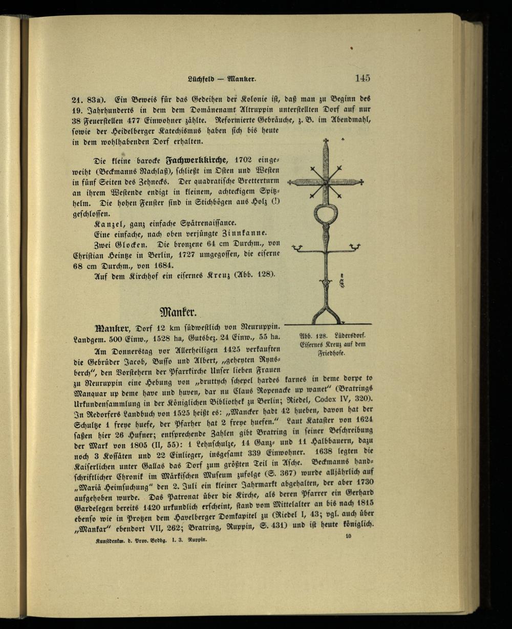 Manker, Dorf 12 km ſüdweſtlich von Neuruppin . Landgem. 500 Einw., 1528 ha, Gutsbez. 24 Einw., 55 ha. Abb. 128. Lüders dorf. Am Donnerstag vor Allerheiligen 1425 verkauften ö dem die Gebrüder Jacob, Buſſo und Albert,„geheyten Ryns⸗; T berch“, den Vorſtehern der Pfarrkirche Unſer lieben Frauen zu Neuruppin eine Hebung von„druttych ſchepel hardes karnes in deme dorpe to Manquar up deme have und huven, dar nu Claus Ropenacke up wanet“(Bratrings Urkundenſammlung in der Königlichen Bibliothek zu Berlin ; Riedel, Codex IV , 320. In Redorfers Landbuch von 1525 heißt es:„Mancker hadt 42 hueben, davon hat der Schultze 4 freye huefe, der Pfarher hat 2 freye huefen.“ Laut Kataſter von 1621 ſaßen hier 26 Hufner; entſprechende Zahlen gibt Bratring in ſeiner Beſchreibung der Mark von 1805 CI, 55): 1 Lehnſchulze, 14 Ganz⸗ und 11 Halbbauern, dazu noch 3 Koſſäten und 22 Einlieger, insgeſamt 339 Einwohner. 1638 legten die Kaiſerlichen unter Gallas das Dorf zum größten Teil in Aſche. Beckmanns handſchriftlicher Chronik im Märkiſchen Muſeum zufolge(S. 367) wurde alljährlich auf „Mariä Heimſuchung“ den 2. Juli ein kleiner Jahrmarkt abgehalten, der aber 1730 aufgehoben wurde. Das Patronat über die Kirche, als deren Pfarrer ein Gerhard Gardelegen bereits 1420 urkundlich erſcheint, ſtand vom Mittelalter an bis nach 1815 ebenſo wie in Protzen dem Havelberger Domkapitel zu(Riedel I, 43; vgl. auch über „Mankar“ ebendort Vll, 262; Bratring, Ruppin , S. 431) und iſt heute königlich.