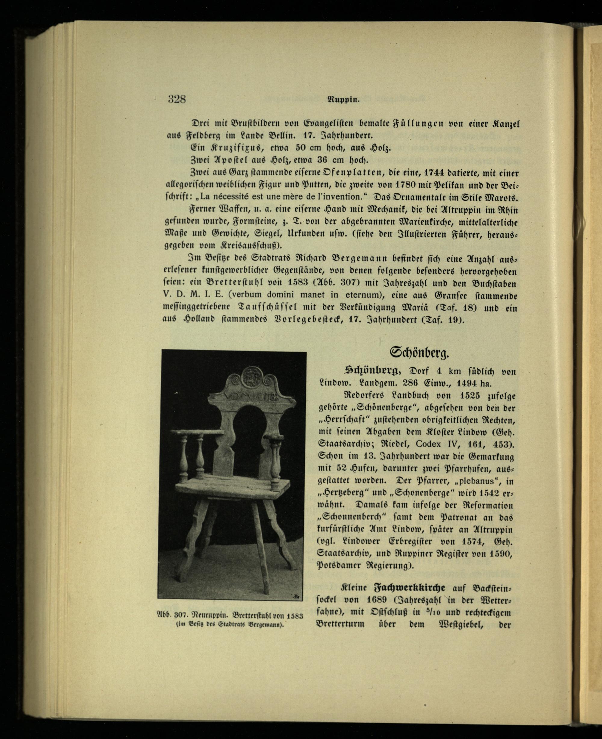 Im Beſitze des Stadtrats Richard Bergemann befindet ſich eine Anzahl aus— erleſener kunſtgewerblicher Gegenſtände, von denen folgende beſonders hervorgehoben ſeien: ein Bretterſtuhl von 1583(Abb. 307) mit Jahreszahl und den Buchſtaben V. D. M. I. E.(verbum domini manet in eternum), eine aus Granſee ſtammende meſſinggetriebene Taufſchüſſel mit der Verkündigung Mariä(Taf. 18) und ein aus Holland ſtammendes Vorlegebeſteck, 17. Jahrhundert(Taf. 19).