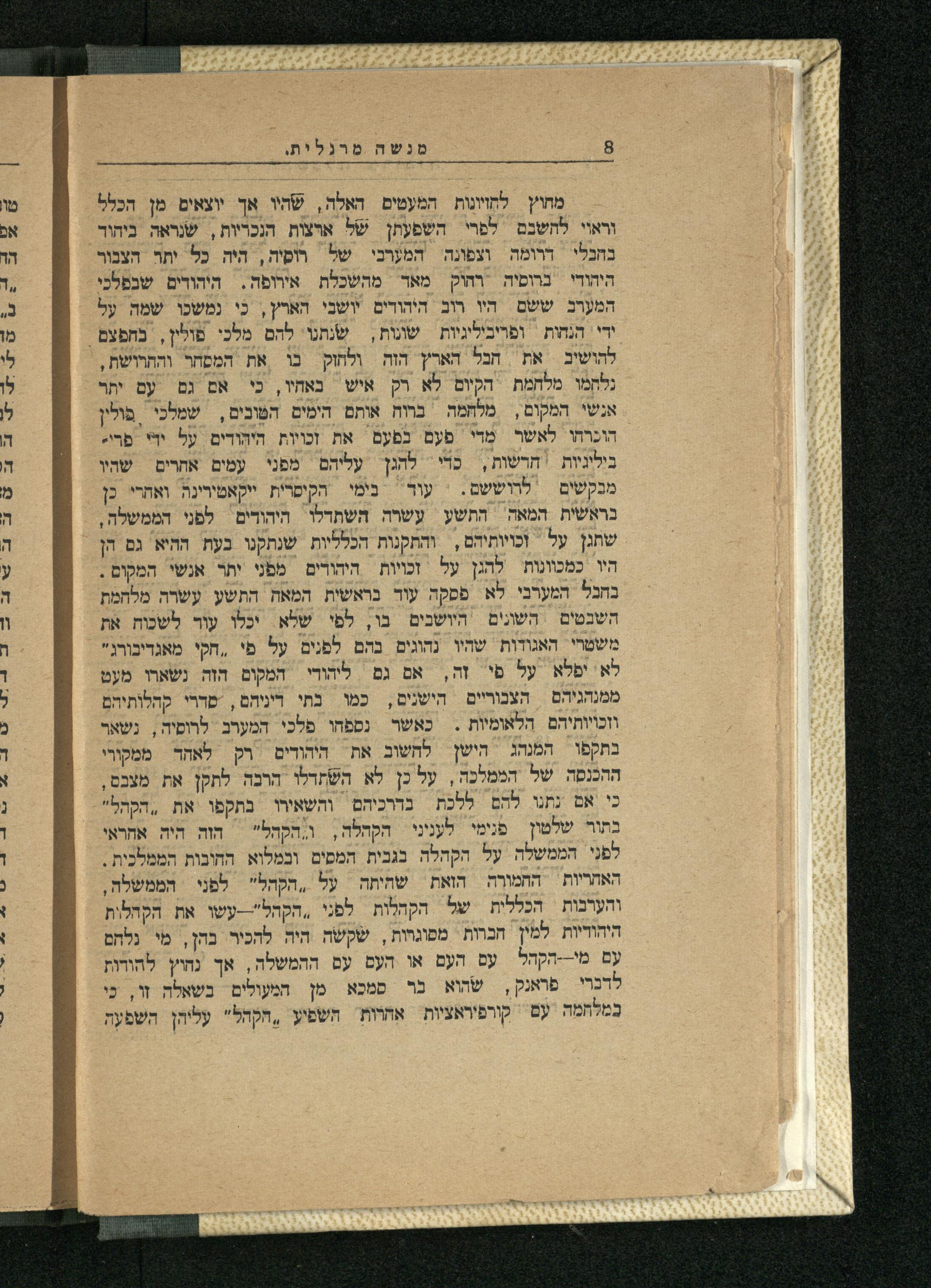 את חנל הארץ הזה ולחוק בו את המסחר והתרושת, נלקמו מלחמת הקום לא רק איש נאחו, כי אם גם עם יתר אנשי המקום, מלחמה ברוח אותם הימים הטונים, פולין הוכרחו לאשר מדי פעם נפעם את זכויות היהודים על ידי פרי חרשות, כדי להגן עליהם מפני עמים אתרים שהיו מנקשים לרוששם. בימי הקיסר'ת ייקאטירינה. ואהרי כן בראשית המאה התשע עשרה השתדלו היהודים לפני הממשלה, שתגן על וכויותיהם, והתקנות הכלליות שנתקנו בעת ההיא גם הן היו כמכונות להגן על זכויות היהורים מפני יתר אנשי המקום. בחנל המערבי לא פסקה עוד בראשית המאה התשע עשרה מלחמת הושנים בו, לפי שלא יכלו עוד לשכות את משטרי האגודות שיו נהוגים בהם לפנים על פ' ,חקי מאגדיבורג" לא יפלא על פי זה, אם גם ליהודי המקום הזה נשארו מעט הצנוריים הישנים, כמו בתי דיניהם, שדרי קהלותיהם וזכויותיהם הלאומיות. כאשר נספחו פלכי המערב לרופיה ,. נשאר בתקפו המנהג הישן לחשוב את רק לאחד ממקווי ההכנסה של הממלכה, על כן לא השתדלו הרבה לתקן את מצכס, כי אם נתנו להם ללכת נדרכיהם והשאירו בתקפו את ,הקהל" בתור פנימי הקהלה, ו הקהל"| הוה היה אחראי לפני הממשלה על הקהלה בגבית המסים. ובמלוא. החובות הממלכית. חמורה שהיתה על ,הקהל" לפני הממשלה, והערנות של הקהלות לפני ,הקהל"--עשו את הקהלות היהודיות. למין חברות מפוגרות, שקשה היה להכיר בהן, מי נלחם עם מי-הקהל עם העם או העם עם ההמשלה, אך נחוץ להודות לדנרי פראנק, שהוא בר סמכא מן המעולים בשאלה זו, כי במלחמה עם קורפ'ראציות אהרות השפיע ,הקהל" עליהן השפעה