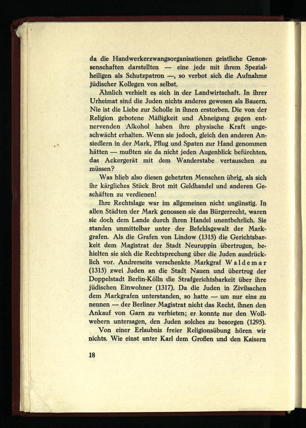 Ihre Rechtslage war im allgemeinen nicht ungünstig. In allen Städten der Mark genossen sie das Bürgerrecht, waren sie doch dem Lande durch ihren Handel unentbehrlich. Sie standen unmittelbar unter der Befehlsgewalt der Markgrafen. Als die Grafen von Lindow (1315) die Gerichtsbarkeit dem Magistrat der Stadt Neuruppin übertrugen, behielten sie sich die Rechtsprechung über die Juden ausdrücklich vor. Andrerseits verschenkte Markgraf Waldemar (1315) zwei Juden an die Stadt Nauen und übertrug der Doppelstadt Berlin-Kölln die Strafgerichtsbarkeit über ihre jüdischen Einwohner (1317). Da die Juden in Zivilsachen dem Markgrafen unterstanden, so hatte — um nur eins zu nennen — der Berliner Magistrat nicht das Recht, ihnen den Ankauf von Garn zu verbieten; er konnte nur den Woll- webern untersagen, den Juden solches zu besorgen (1295).
