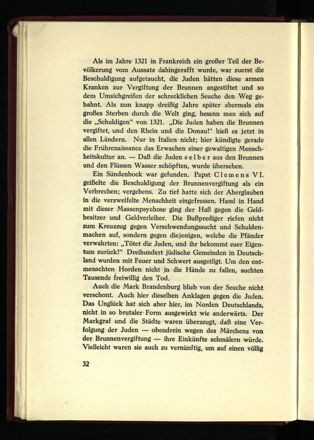 Als im Jahre 1321 in Frankreich ein großer Teil der Bevölkerung vom Aussatz dahingerafft wurde, war zuerst die Beschuldigung aufgetaucht, die Juden hätten diese armen Kranken zur Vergiftung der Brunnen angestiftet und so dem Umsichgreifen der schrecklichen Seuche den Weg gebahnt. Als nun knapp dreißig Jahre später abermals ein großes Sterben durch die Welt ging, besann man sich auf die „Schuldigen“ von 1321. „Die Juden haben die Brunnen vergiftet, und den Rhein und die Donau!“ hieß es jetzt in allen Ländern. Nur in Italien nicht; hier kündigte gerade die Frührenaissance das Erwachen einer gewaltigen Menschheitskultur an. — Daß die Juden selber aus den Brunnen und den Flüssen Wasser schöpften, wurde übersehen.