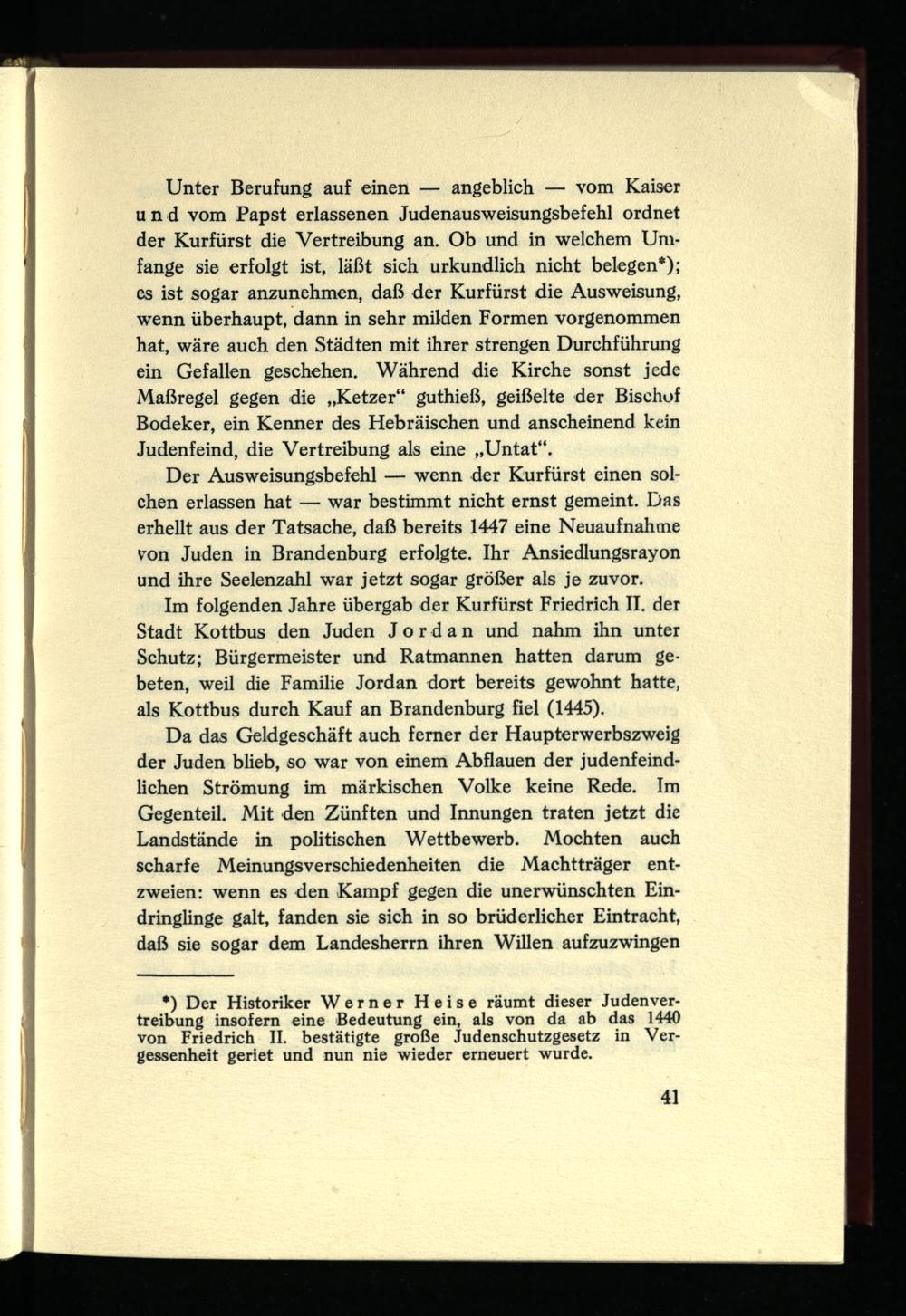 *) Der Historiker Werner Heise räumt dieser Judenvertreibung insofern eine Bedeutung ein, als von da ab das 1440 von Friedrich II. bestätigte große Judenschutzgesetz in Vergessenheit geriet und nun nie wieder erneuert wurde.