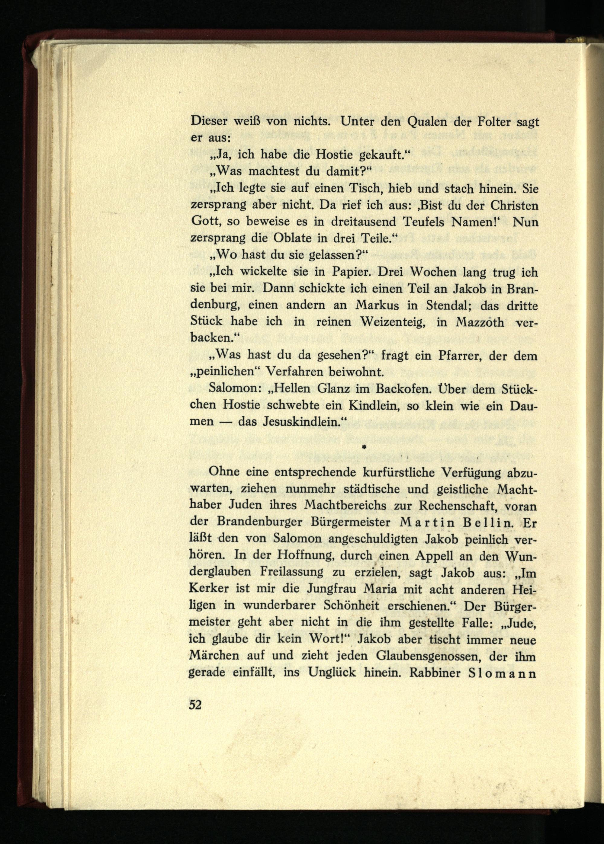 „Ich wickelte sie in Papier. Drei Wochen lang trug ich sie bei mir. Dann schickte ich einen Teil an Jakob in Brandenburg, einen andern an Markus in Stendal; das dritte Stück habe ich in reinen Weizenteig, in Mazzoth verbacken.“