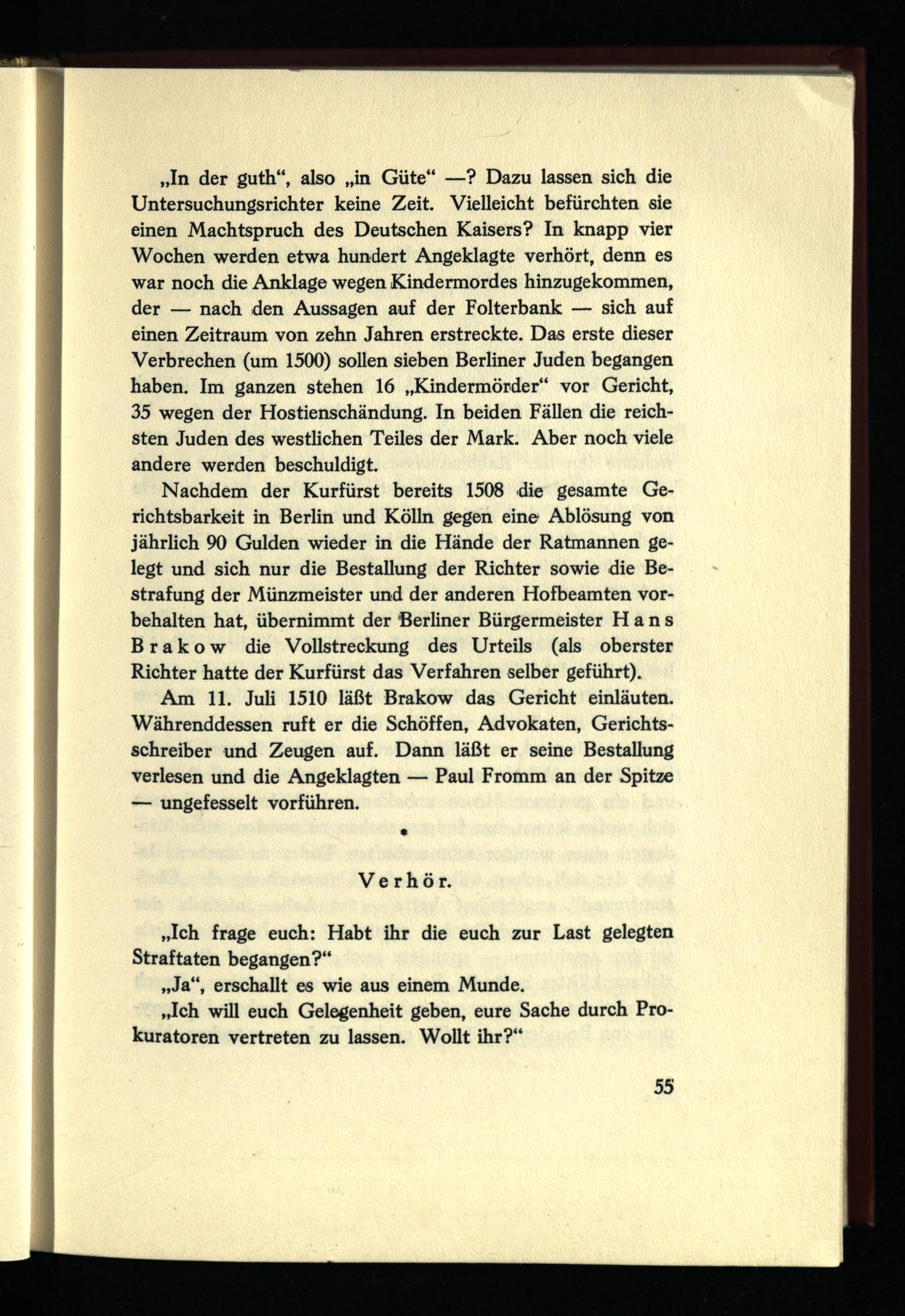 „In der guth“, also „in Güte“ —? Dazu lassen sich die Untersuchungsrichter keine Zeit. Vielleicht befürchten sie einen Machtspruch des Deutschen Kaisers? In knapp vier Wochen werden etwa hundert Angeklagte verhört, denn es war noch die Anklage wegen Kindermordes hinzugekommen, der — nach den Aussagen auf der Folterbank — sich auf einen Zeitraum von zehn Jahren erstreckte. Das erste dieser Verbrechen (um 1500) sollen sieben Berliner Juden begangen haben. Im ganzen stehen 16 „Kindermörder“ vor Gericht, 35 wegen der Hostienschändung. In beiden Fällen die reichsten Juden des westlichen Teiles der Mark. Aber noch viele andere werden beschuldigt.