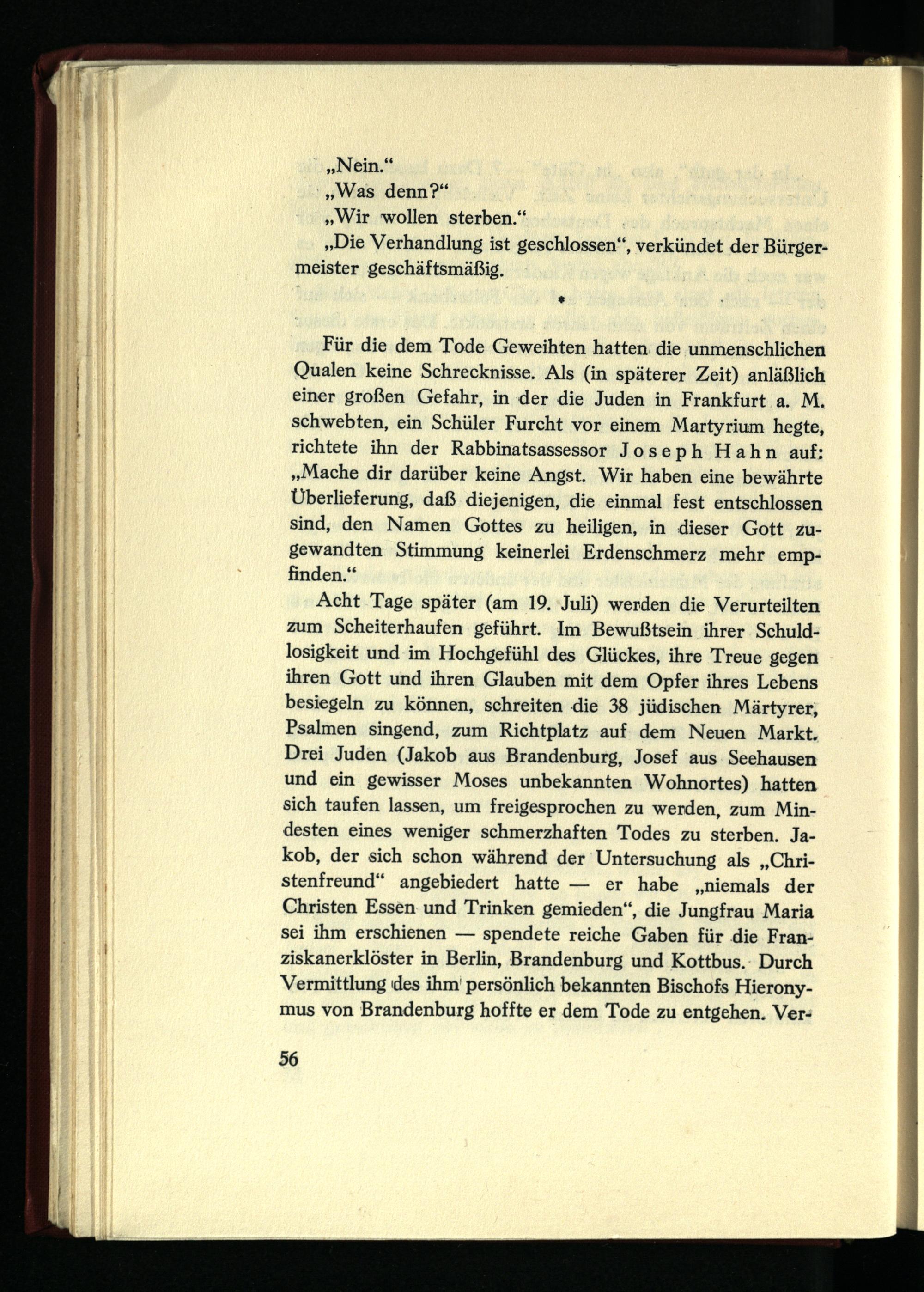 Acht Tage später (am 19. Juli) werden die Verurteilten zum Scheiterhaufen geführt. Im Bewußtsein ihrer Schuldlosigkeit und im Hochgefühl des Glückes, ihre Treue gegen ihren Gott und ihren Glauben mit dem Opfer ihres Lebens besiegeln zu können, schreiten die 38 jüdischen Märtyrer, Psalmen singend, zum Richtplatz auf dem Neuen Markt. Drei Juden (Jakob aus Brandenburg, Josef aus Seehausen und ein gewisser Moses unbekannten Wohnortes) hatten sich taufen lassen, um freigesprochen zu werden, zum Mindesten eines weniger schmerzhaften Todes zu sterben. Jakob, der sich schon während der Untersuchung als „Christenfreund“ angebiedert hatte — er habe „niemals der Christen Essen und Trinken gemieden“, die Jungfrau Maria sei ihm erschienen — spendete reiche Gaben für die Franziskanerklöster in Berlin, Brandenburg und Kottbus. Durch Vermittlung des ihm persönlich bekannten Bischofs Hieronymus von Brandenburg hoffte er dem Tode zu entgehen. Ver-