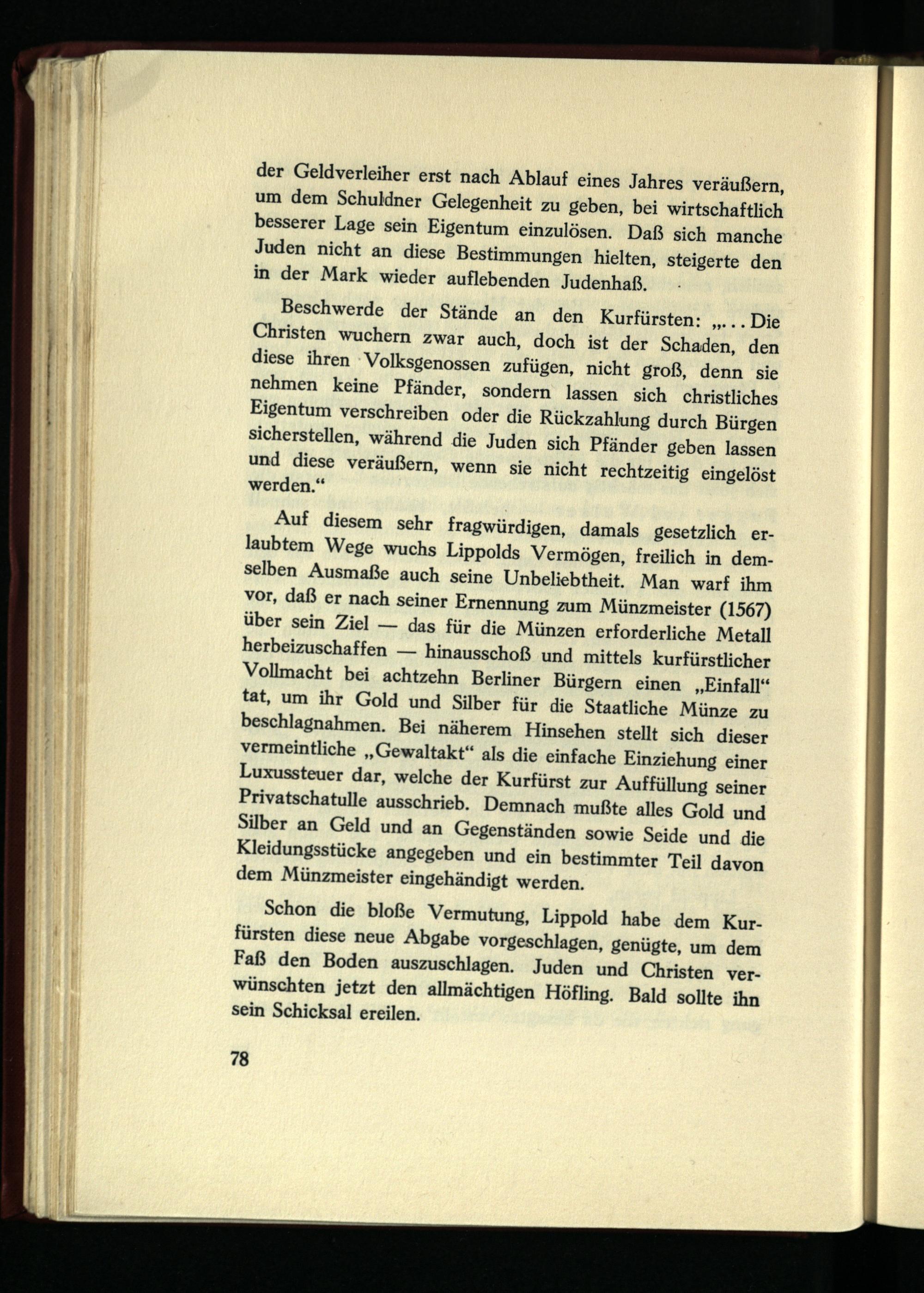 der Geldverleiher erst nach Ablauf eines Jahres veräußern, um dem Schuldner Gelegenheit zu geben, bei wirtschaftlich besserer Lage sein Eigentum einzulösen. Daß sich manche Juden nicht an diese Bestimmungen hielten, steigerte den in der Mark wieder auflebenden Judenhaß.