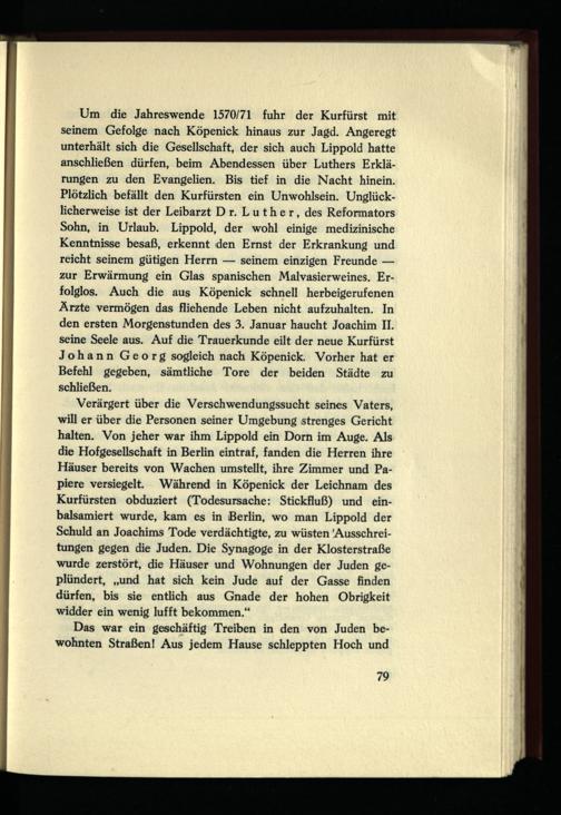 Verärgert über die Verschwendungssucht seines Vaters, will er über die Personen seiner Umgebung strenges Gericht halten. Von jeher war ihm Lippold ein Dom im Auge. Als die Hofgesellschaft in Berlin eintraf, fanden die Herren ihre Häuser bereits von Wachen umstellt, ihre Zimmer und Papiere versiegelt. Während in Köpenick der Leichnam des Kurfürsten obduziert (Todesursache: Stickfluß) und einbalsamiert wurde, kam es in Berlin, wo man Lippold der Schuld an Joachims Tode verdächtigte, zu wüsten Ausschreitungen gegen die Juden. Die Synagoge in der Klosterstraße wurde zerstört, die Häuser und Wohnungen der Juden geplündert, „und hat sich kein Jude auf der Gasse finden dürfen, bis sie entlieh aus Gnade der hohen Obrigkeit widder ein wenig lufft bekommen.“