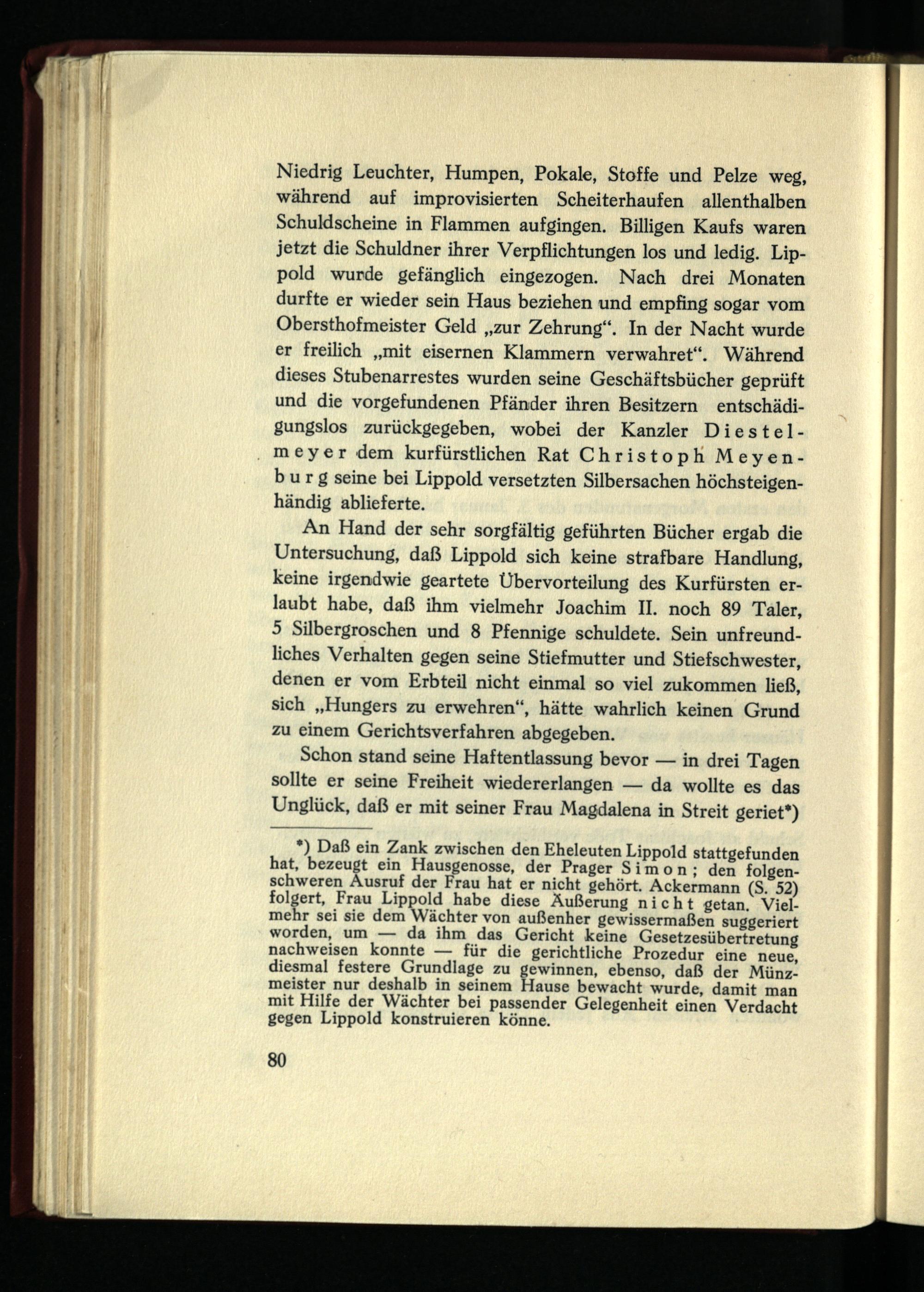 Niedrig Leuchter, Humpen, Pokale, Stoffe und Pelze weg, während auf improvisierten Scheiterhaufen allenthalben Schuldscheine in Flammen aufgingen. Billigen Kaufs waren jetzt die Schuldner ihrer Verpflichtungen los und ledig. Lip- pold wurde gefänglich eingezogen. Nach drei Monaten durfte er wieder sein Haus beziehen und empfing sogar vom Obersthofmeister Geld „zur Zehrung“. In der Nacht wurde er freilich „mit eisernen Klammern verwahret“. Während dieses Stubenarrestes wurden seine Geschäftsbücher geprüft und die vorgefundenen Pfänder ihren Besitzern entschädigungslos zurückgegeben, wobei der Kanzler Diestel- meyer dem kurfürstlichen Rat Chri stoph Meyenburg seine bei Lippold versetzten Silbersachen höchsteigenhändig ablieferte.