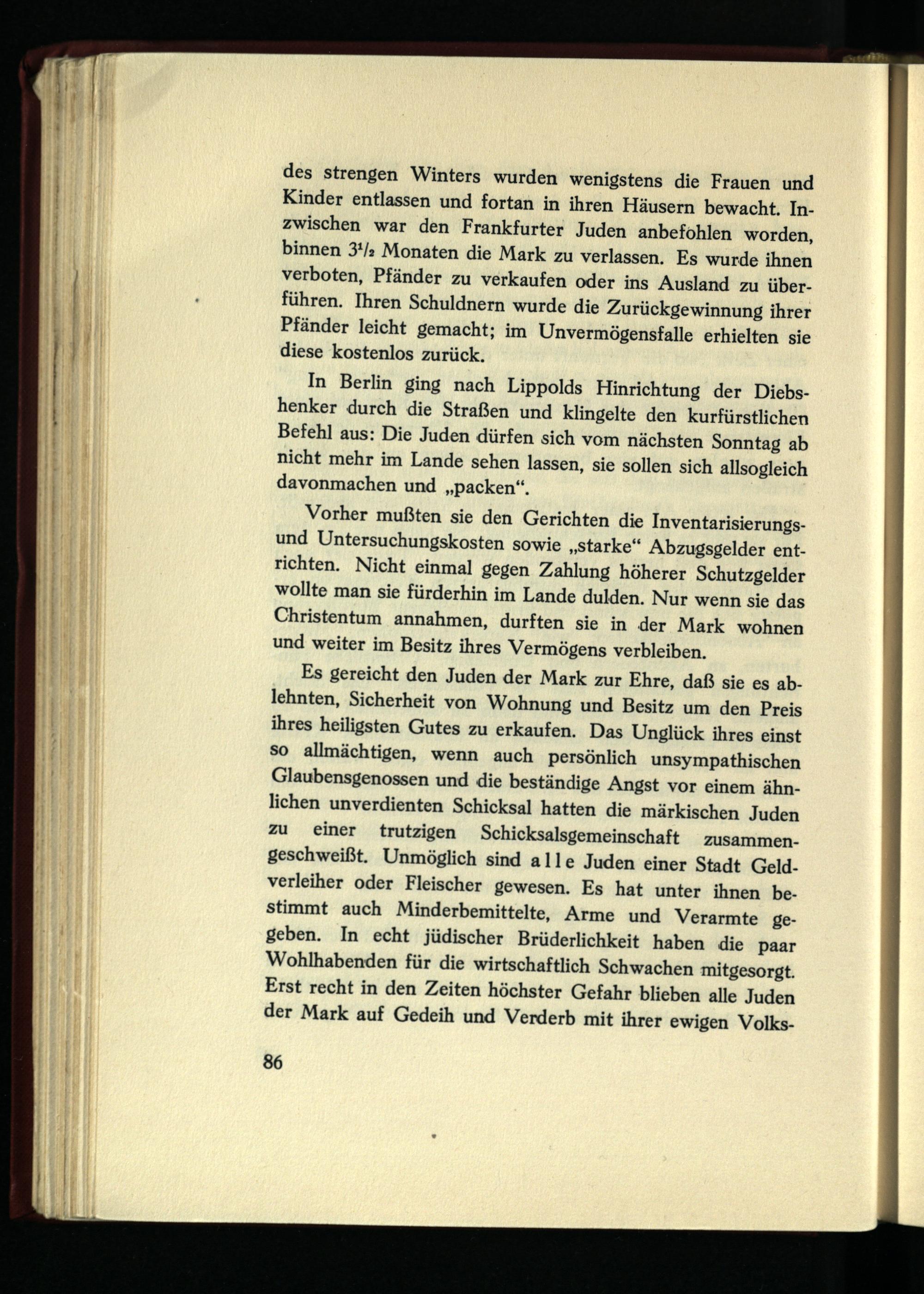 Es gereicht den Juden der Mark zur Ehre, daß sie es ablehnten, Sicherheit von Wohnung und Besitz um den Preis ihres heiligsten Gutes zu erkaufen. Das Unglück ihres einst so allmächtigen, wenn auch persönlich unsympathischen Glaubensgenossen und die beständige Angst vor einem ähnlichen unverdienten Schicksal hatten die märkischen Juden zu einer trutzigen Schicksalsgemeinschaft zusammengeschweißt. Unmöglich sind alle Juden einer Stadt Geldverleiher oder Fleischer gewesen. Es hat unter ihnen bestimmt auch Minderbemittelte, Arme und Verarmte gegeben. In echt jüdischer Brüderlichkeit haben die paar Wohlhabenden für die wirtschaftlich Schwachen mitgesorgt. Erst recht in den Zeiten höchster Gefahr blieben alle Juden der Mark auf Gedeih und Verderb mit ihrer ewigen Volks-