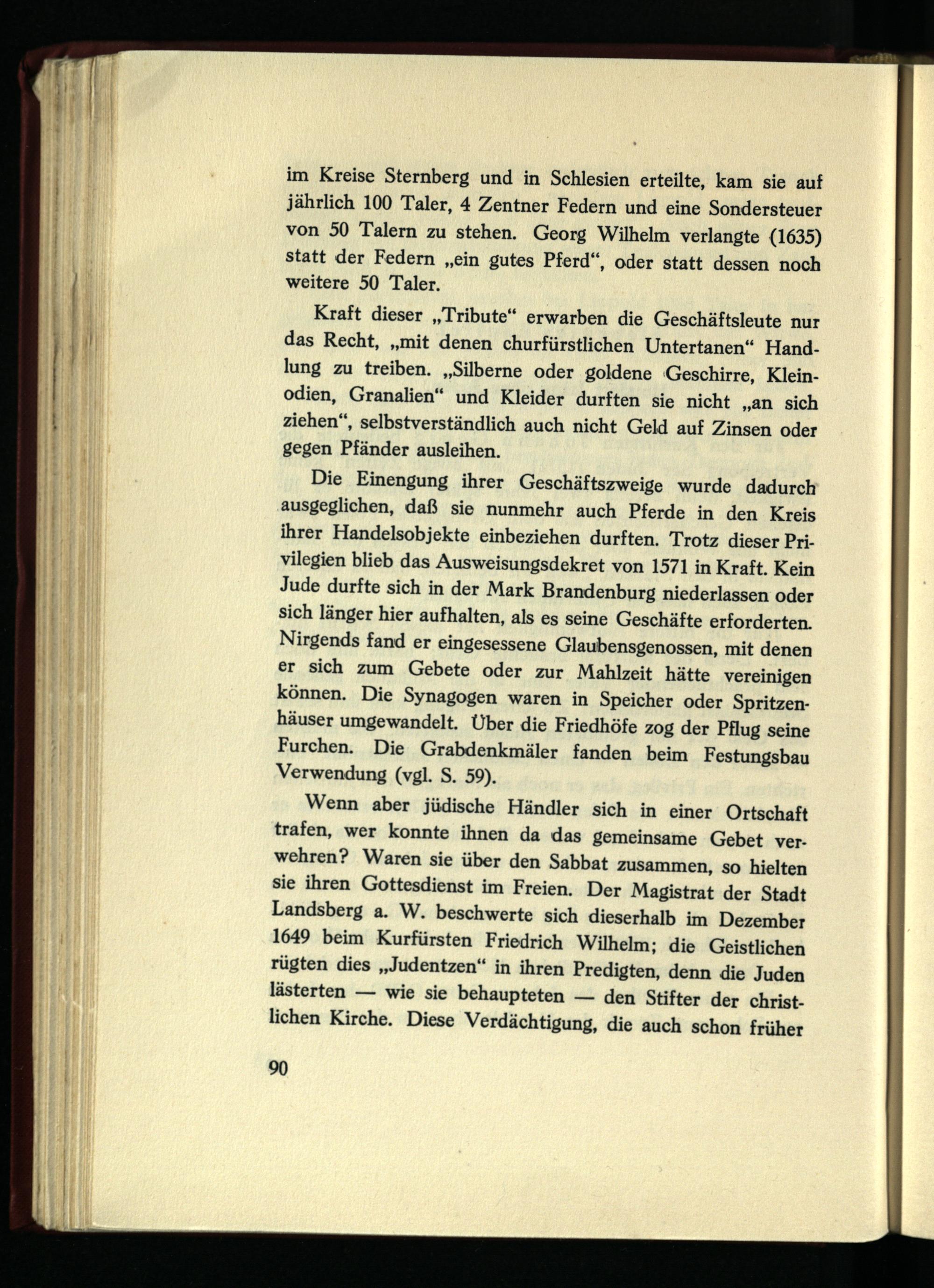 Die Einengung ihrer Geschäftszweige wurde dadurch ausgeglichen, daß sie nunmehr auch Pferde in den Kreis ihrer Handelsobjekte einbeziehen durften. Trotz dieser Privilegien blieb das Ausweisungsdekret von 1571 in Kraft. Kein Jude durfte sich in der Mark Brandenburg niederlassen oder sich länger hier aufhalten, als es seine Geschäfte erforderten. Nirgends fand er eingesessene Glaubensgenossen, mit denen er sich zum Gebete oder zur Mahlzeit hätte vereinigen können. Die Synagogen waren in Speicher oder Spritzenhäuser umgewandelt. Über die Friedhöfe zog der Pflug seine Furchen. Die Grabdenkmäler fanden beim Festungsbau Verwendung (vgl. S. 59).