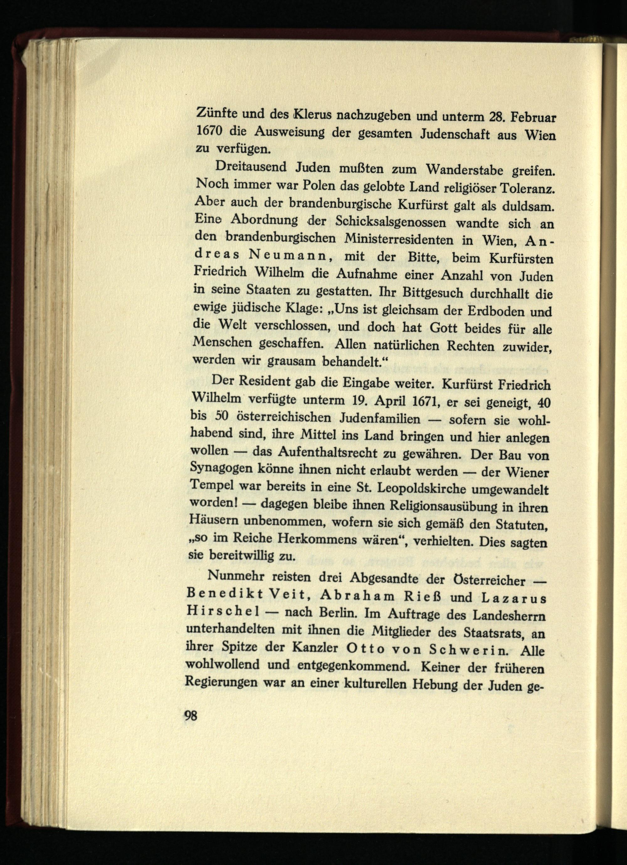 Dreitausend Juden mußten zum Wanderstabe greifen. Noch immer war Polen das gelobte Land religiöser Toleranz. Aber auch der brandenburgische Kurfürst galt als duldsam. Eine Abordnung der Schicksalsgenossen wandte sich an den brandenburgischen Ministerresidenten in Wien, Andreas Neumann, mit der Bitte, beim Kurfürsten Friedrich Wilhelm die Aufnahme einer Anzahl von Juden in seine Staaten zu gestatten. Ihr Bittgesuch durchhallt die ewige jüdische Klage: „Uns ist gleichsam der Erdboden und die Welt verschlossen, und doch hat Gott beides für alle Menschen geschaffen. Allen natürlichen Rechten zuwider, werden wir grausam behandelt.“