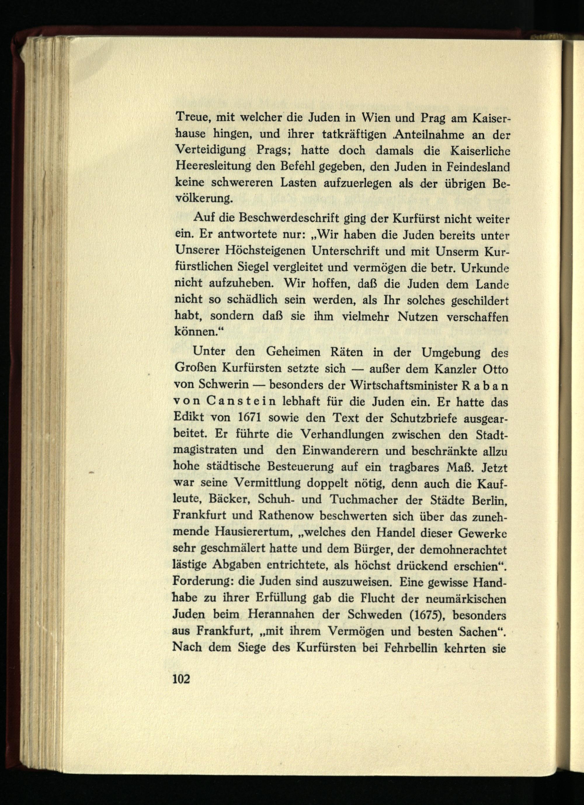 Unter den Geheimen Räten in der Umgebung des Großen Kurfürsten setzte sich — außer dem Kanzler Otto von Schwerin — besonders der Wirtschaftsminister Raban von Canstein lebhaft für die Juden ein. Er hatte das Edikt von 1671 sowie den Text der Schutzbriefe ausgearbeitet. Er führte die Verhandlungen zwischen den Stadtmagistraten und den Einwanderern und beschränkte allzu hohe städtische Besteuerung auf ein tragbares Maß. Jetzt war seine Vermittlung doppelt nötig, denn auch die Kaufleute, Bäcker, Schuh- und Tuchmacher der Städte Berlin, Frankfurt und Rathenow beschwerten sich über das zunehmende Hausierertum, „welches den Handel dieser Gewerke sehr geschmälert hatte und dem Bürger, der demohnerachtet lästige Abgaben entrichtete, als höchst drückend erschien“. Forderung: die Juden sind auszuweisen. Eine gewisse Handhabe zu ihrer Erfüllung gab die Flucht der neumärkischen Juden beim Herannahen der Schweden (1675), besonders aus Frankfurt, „mit ihrem Vermögen und besten Sachen“. Nach dem Siege des Kurfürsten bei Fehrbellin kehrten sie