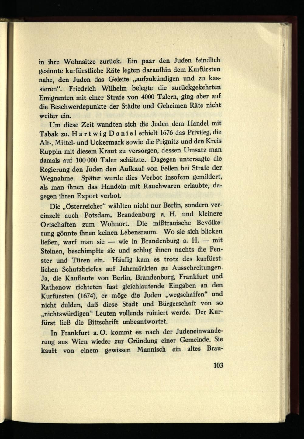 Die „Österreicher“ wählten nicht nur Berlin, sondern vereinzelt auch Potsdam, Brandenburg a. H. und kleinere Ortschaften zum Wohnort. Die mißtrauische Bevölkerung gönnte ihnen keinen Lebensraum. Wo sie sich blicken ließen, warf man sie — wie in Brandenburg a. H. — mit Steinen, beschimpfte sie und schlug ihnen nachts die Fenster und Türen ein. Häufig kam es trotz des kurfürstlichen Schutzbriefes auf Jahrmärkten zu Ausschreitungen. Ja, die Kaufleute von Berlin, Brandenburg, Frankfurt und Rathenow richteten fast gleichlautende Eingaben an den Kurfürsten (1674), er möge die Juden „wegschaffen“ und nicht dulden, daß diese Stadt und Bürgerschaft von so „nichtswürdigen“ Leuten vollends ruiniert werde. Der Kurfürst ließ die Bittschrift unbeantwortet.